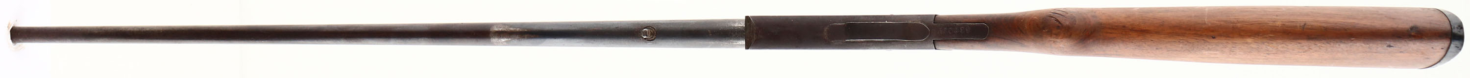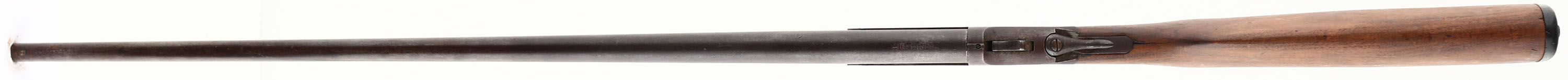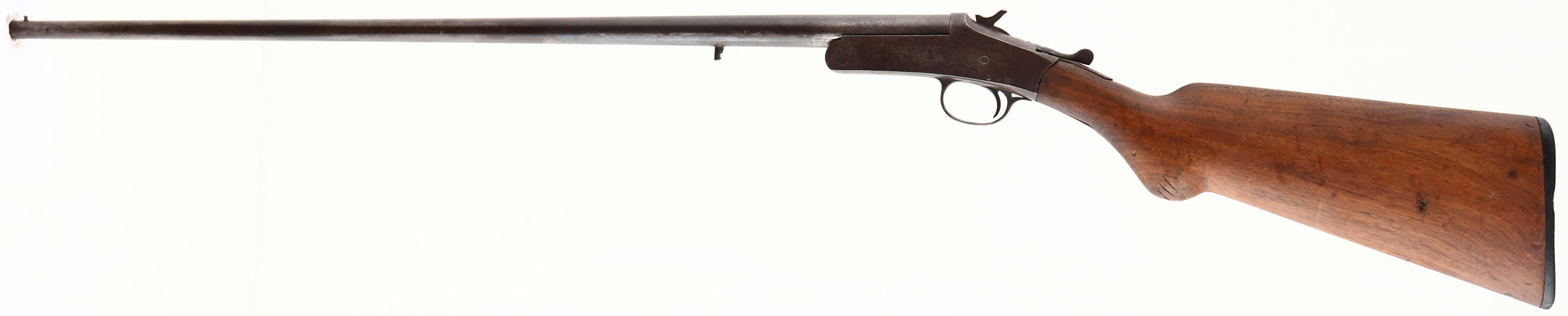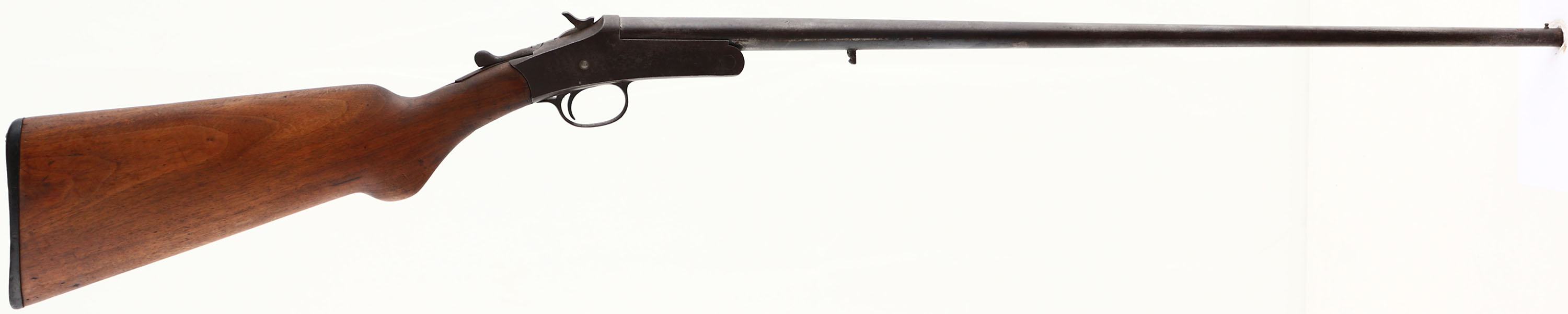H.S.B & Co, Ruso, CAL: 410-44, MFG: N/A, SN: A16039, Break Action Single Shot Shotgun, 26'' barrel. The round knob wood stock is good, having been sanded & refinished. There is a crack coming off the upper tang, along with nicks, dings & scrapes. The metal blue finish has fully toned to a brown patina. Bore is good & bright, with roughness & scarring. Brass bead front sight. H&R checkered plastic buttplate. FFL or C&R Req. - Value: 50 to 150