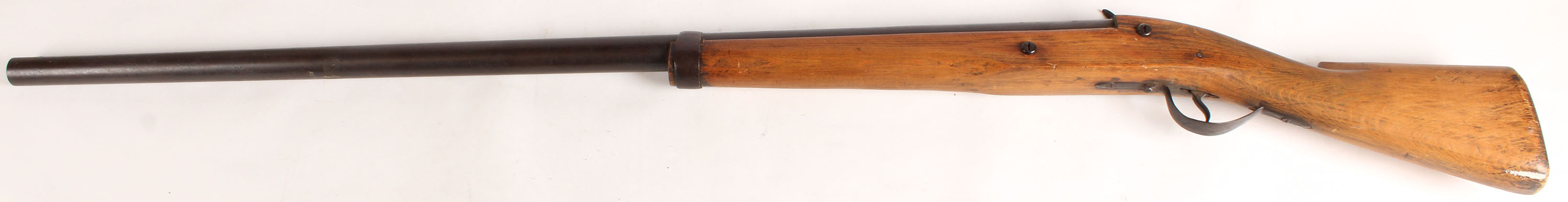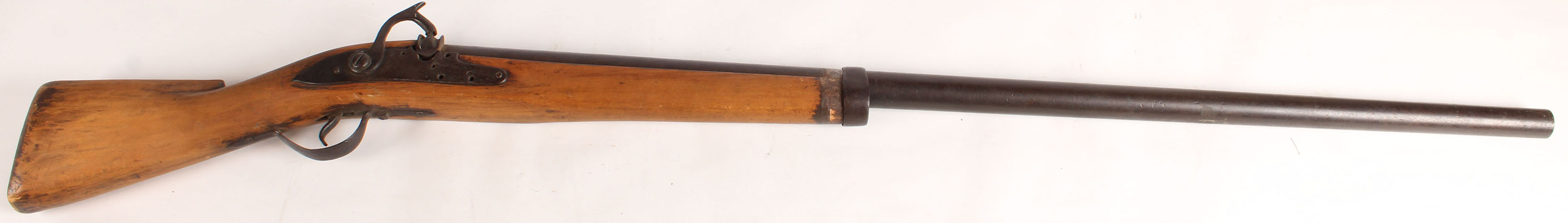 Punt/Market Gun, 4 Ga, Percussion muzzleloader converted from flintlock, MFG: pre 1900's, 47'' barrel. The straight wrist wood stock is fair with multiple large cracks & grain pops, scratches, dings, nicks, & wear from use/age. The metal has toned a chocolate brown patina with spots of rust speckling & light pitting. The boor is poor. Has lots of rust & pitting. Barrel holds a bead front sight. Stock does not have a buttplate. This large gun would have been assembled from bought parts like the lock & barrel, but with a homemade stock by a market hunter, & they would have used it to take out large amounts of bird game in one shot, to then sell in the market in town to make a living. Muzzleloader No FFL Req. - Value: 500 to 1000