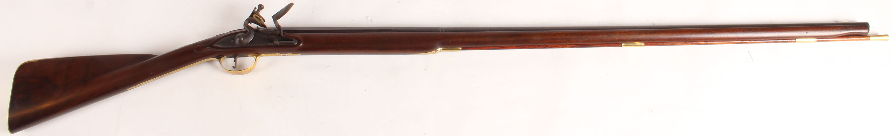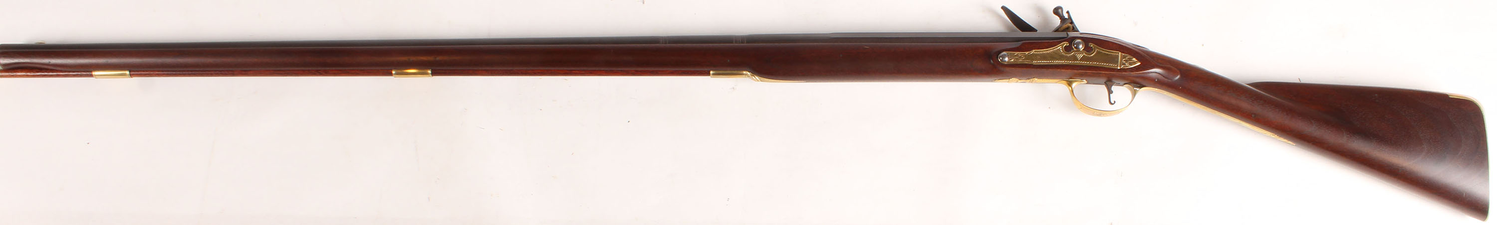 J.E. Brown, Commercial Reproduction Flintlock Shotgun, CAL: BALL, MFG: N/A, SN: N/A, Muzzleloader Shotgun, 42'' barrel. Top of the barrel is marked ''J.E BROWN'' in cursive. The straight grip wood stock is excellent. There is a raised decorative oval initial plate on the top of the wrist. The brown metal finish on the barrel & sideplate is excellent. Brass components are all bright & shiny. Bore is excellent. Brass buttplate. Blackpowder, No FFL Req. - Value: 300 to 500