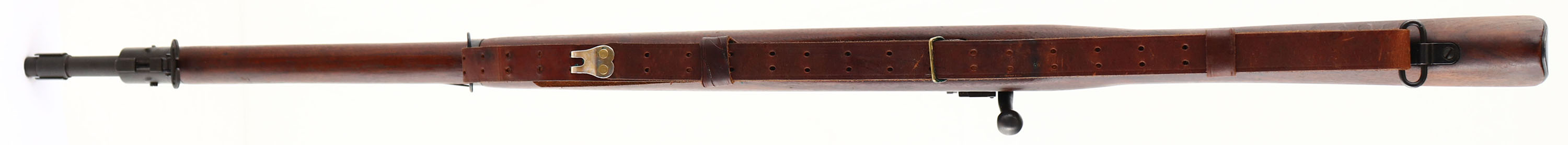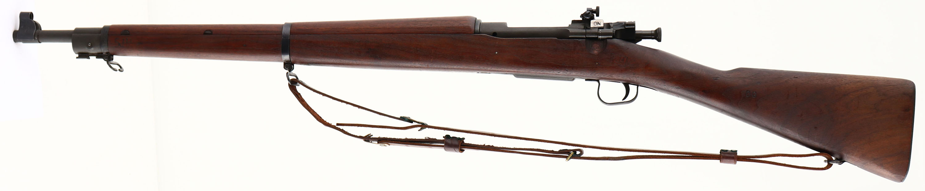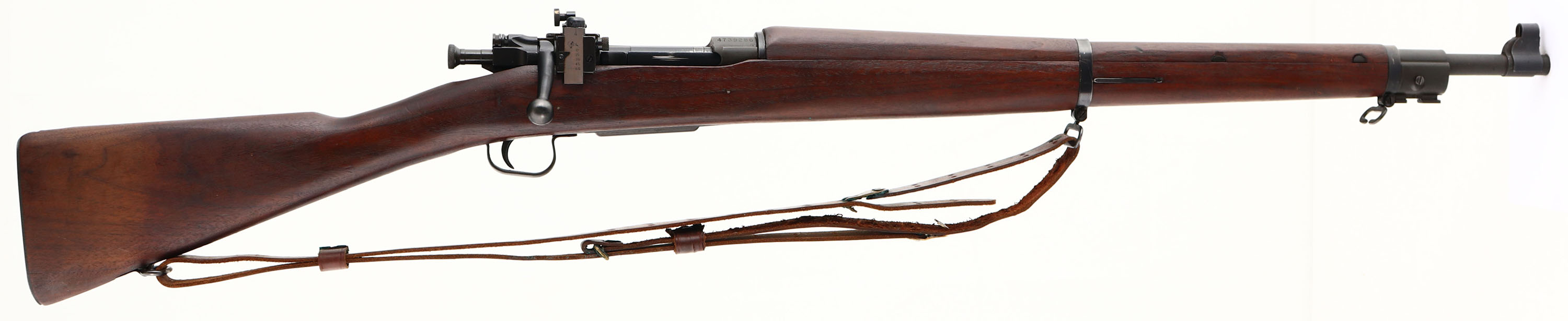 Smith-Corona, Model: 03-A3, Cal: .30-06, MFG: 1944, S/N: 4739286, Bolt action rifle, 24'' barrel. The straight wrist walnut stock is excellent with only a few minor nicks, dings, & dents. The left side of the stock above the trigger I marked with a ''FJA'' in a box inspection mark cartouche & the US ordnance crossed cannons logo. The left cheek of stock is marked ''OG''. The bottom of the wrist is marked with a ''M'' & the circle ''P'' firing proof cartouche. The bottom of the stock Infront of the magazine is marked with a ''5'' in a triangle, ''13'' in a box, ''11'' in a circle, & a ''7'' in a diamond stamps. There is also a ''SJP'' in the bottom of the stock Infront of the magazine & on the left end of the stock near the muzzle. The front barrel band has been hand etched ''JPOYSER'' on the left side. The parkerized metal finish has full coverage & rates 90% with some light thinning/wear. The receiver band is marked ''U.S.'', ''SMITH-CORONA'', ''MODEL 03-A3'', & the S/N. the top end of the barrel is marked ''S C'', ''Flaming bomb, ''7-43''. The bottom of the barrel is marked with a ''P''. The bore is very good, near excellent. Its bright & mirror like with only light rifling thinning. Bore is the 4 groove rifling. The barrel holds a blade front sight with a removable sight hood. The rear of the receiver has mounted a aftermarket fully adjustable aperture rear sight. The stock carries a parkerized steel, trapdoor buttplate with light wear. There is nothing inside the trapdoor. The rifle has both sling loops with the third stacking swivel. Rifle comes with a leather M1907 style sling. A beautiful example of a Smith-Corona 03-A3. FFL or C&R Req. - Value: 600 to 1200