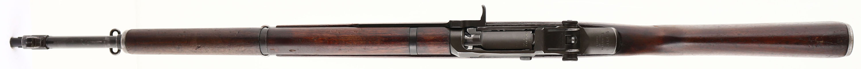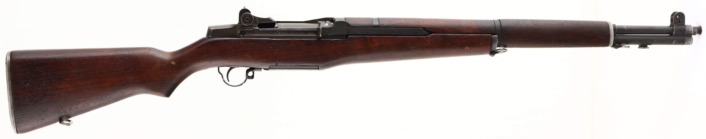 Harrington & Richardson, Model: M1 Garand, Cal: .30-06, MFG: 1954, S/N: 5616445, Semi-auto rifle, 24'' barrel. The semi-pistol grip black walnut stock is very good with nicks, dings, dents, scratches & wear from use/age. There is a ''R.R.A'' stamp in the left cheek meaning this rifle war rebuilt/refurbished after the war at the Red River Arsenal in Texarkana Texas. There is a half worn ''P'' in square proof on the bottom of the wrist. The parkerized metal finish on the receiver rates 90% with full coverage & just some light wear. The blued finish on the barrel rates 85% with some areas of thinning & wear. The top rear of receiver is marked ''U.S.RIFLE'', ''CAL. .30 M1'', ''H.&R. ARMS CO.'', & the S/N. the top of the bolt is marked with a drawing number, ''H.R.A'', & ''U.W.''. The right rear sight of the barrel is marked ''HRA 6535448 4-55 RS 51'', ''M'', ''X''. The bore is excellent. Its bright & mirror like with only minor wear. The barrel holds a wide blade front sight with protective wings, & the rear of the receiver has a fully adjustable aperture rear sight. The stock carries a checkered steel trapdoor buttplate with a oiler/grease bottle inside. Rifle has both sling loops with the third stacking swivel. A very nice example of a Korea war era M1 Garand. FFL or C&R Req. - Value: 1500 to 3000