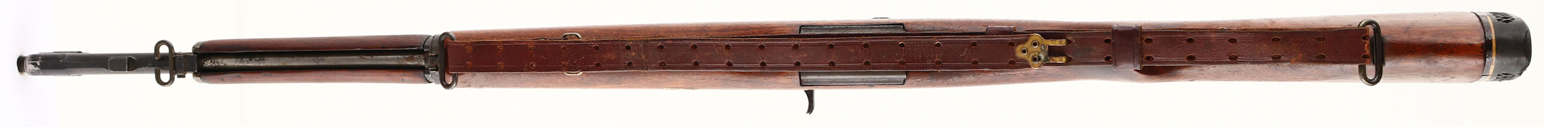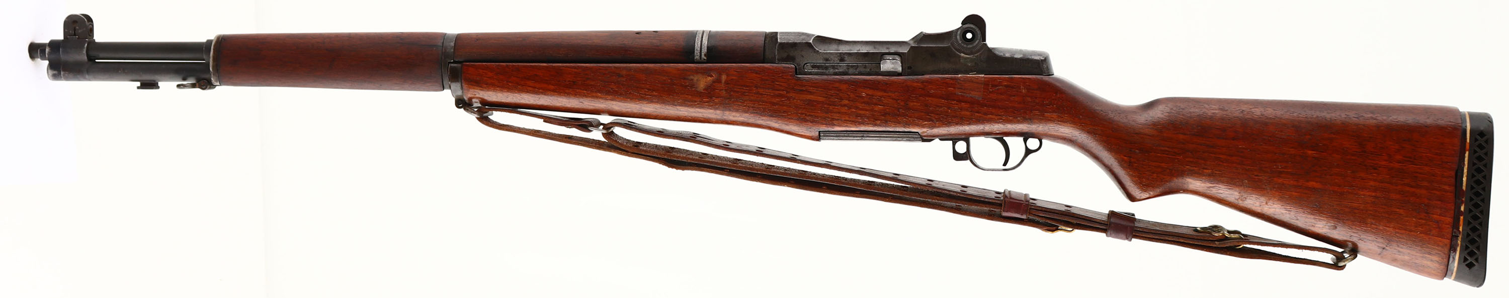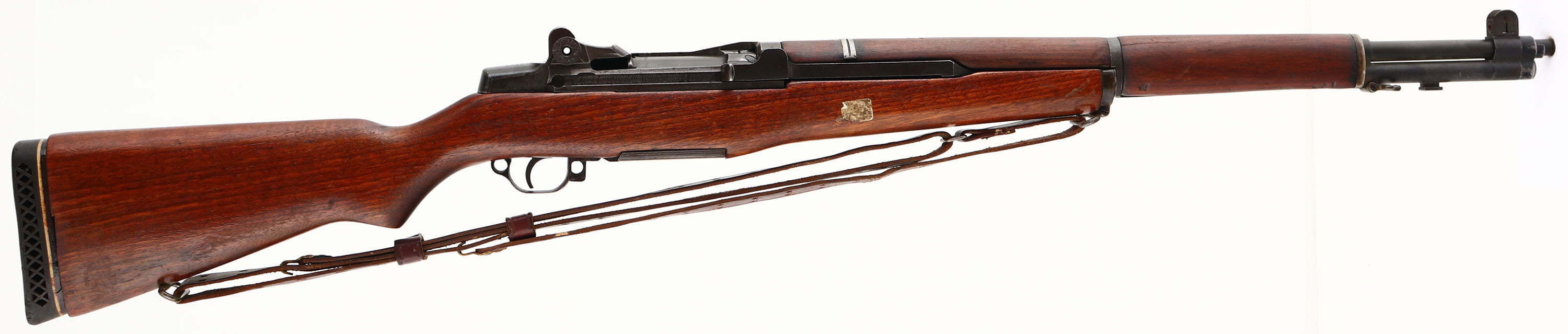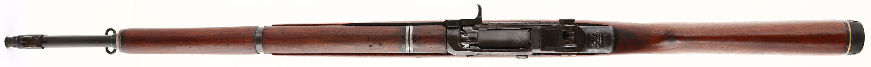 Springfield Armory, Model: M1 Garand, Cal: .30-06, MFG: 1941, S/N: 220057, Semi-Auto rifle, 24'' barrel. The semi-pistol grip wood stock is good with small nicks, dings, & scratches from use, has a sticker mark on right side. Stock has been lightly sanded & re-finished. Stock has also been cut down to make the LOP the same with the recoil pad installed. There are two 1 1/2'' hairline tight cracks on the left & right of the forward handguard. There are no visible cartouches on the stock. The black phosphate metal finish rates 45% on the receiver with areas of thinned finish & gun metal gray. The barrels metal finish rates 90% with small areas of wear. The top rear of the receiver is marked ''U.S. RIFLE'', ''CAL .30 M1'', ''SPRINGFIELD'', ''ARMORY'', & S/N. the top of the bolt is marked with a drawing number. The right side of the barrel is marked ''X9'', & a Winchester proof stamp. The smaller components of the rifle are a mix of Springfield & Winchester parts. The bore is good. Its bright with areas of roughness/ light pitting & thinned rifling. The barrel holds a blade front sight with protective wings. The rear sight is missing components. The stock carries a aftermarket ventilated rubber recoil pad. The rifle has both bottom sling loops with the third stacking swivel. Rifle comes with a after market 1907 style leather sling. FFL or C&R Req - Value: 500 to 1000