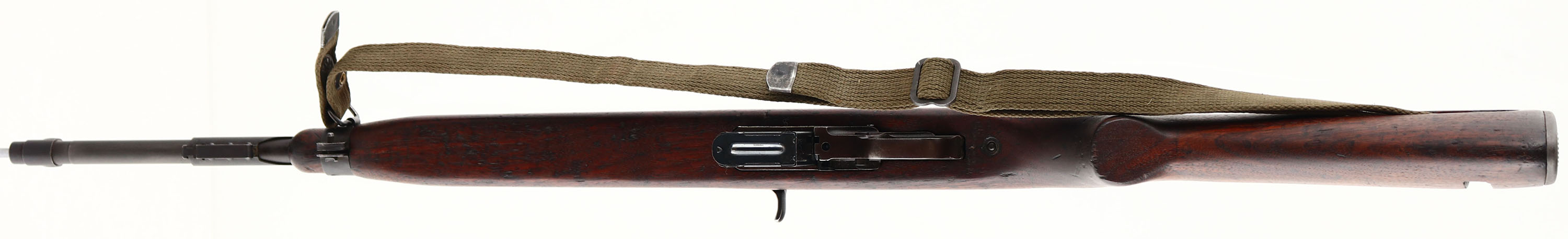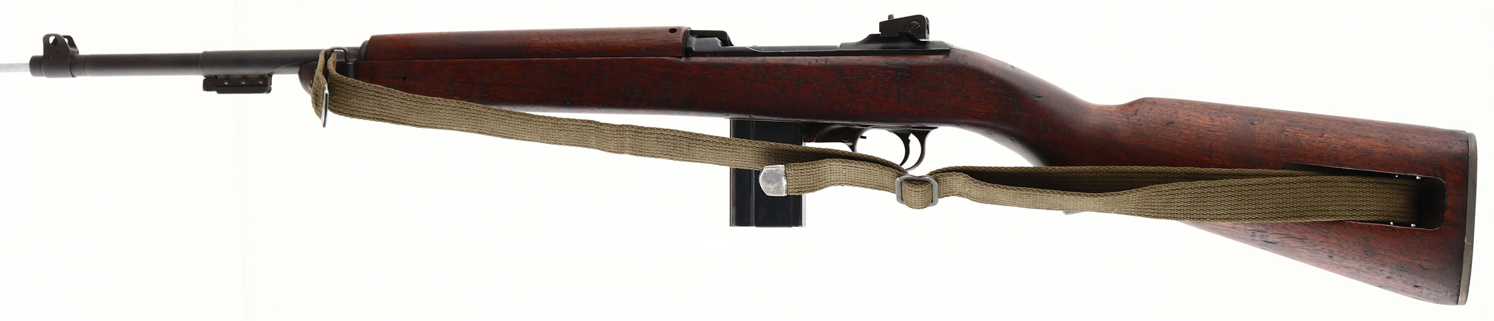 Winchester, Model: M1 Carbine, Cal: .30 Carbine, MFG: 1944, S/N: 5773884, Semi-auto rifle, 17 3/4'' barrel. The semi-pistol grip, Type 3 wood stock is very good with minor nicks, dings, scratches, & wear from use/age. The stock has no visible markings. The parkerized metal finish has full coverage & rates 95%. The receiver band is marked ''U.S.CARBINE'', ''CAL. .30M1''. The rear of the receiver is marked ''WINCHESTER'', & the S/N. the top end of the barrel is marked ''N''. The barrel band is marked ''JM''. The bore is excellent. Bright & mirror like with minimal wear. The barrel holds a wide blade front sight with protective wings. The rear of the receiver holds a fully adjustable aperture rear sight. The rear sight aperture leaf has been welded in the 100 yard zero & the windage elevation knob is missing & has been replaced with a normal screw. The right side of the rear sight base has a doubled stamped ''PI'' mark. The stock carries a checkered steel buttplate. The rifle has the oil bottle/ rear sling mount & the left side front sling loop. Rifle comes with a period correct canvas sling, oiler bottle, & one 15 Rd. magazine marked ''IS'' on the back. FFL or C&R Req. - Value: 1000 to 2000