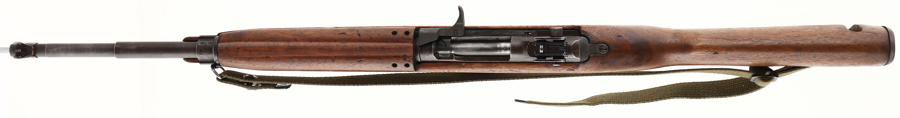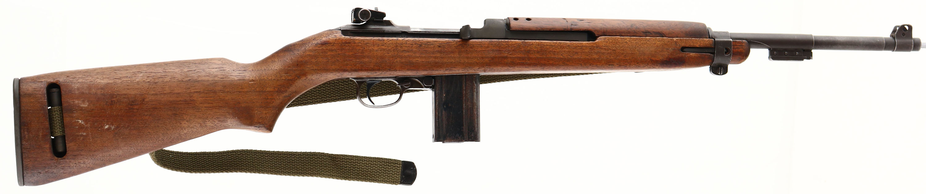 Underwood, Model: M1 Carbine, Cal: .30 Carbine, MFG: 1943, S/N: 1400594, Semi-auto rifle, 17 3/4'' barrel. The semi-pistol grip, Type 3 wood stock is very good with minor nicks, dings, scratches, & wear from use/age. There are faint remains of white paint marking on the right cheek of the stock. There is a 3/4'' tight crack on the top of the wrist that emanates from the upper tang. The parkerized metal finish has full coverage & rates 80% with areas of wear & thinning. The receiver band is marked ''U.S.CARBINE'', ''CAL. .30M1''. The rear of the receiver is marked ''UNDERWOOD'', & the S/N. the top end of the barrel is marked ''UNDERWOOD'', ''2-43'', US ordinance flaming bomb, & ''P''. The barrel band is marked ''AI''. The bore is excellent. Bright & mirror like with minimal wear. The barrel holds a wide blade front sight with protective wings. The rear of the receiver holds a fully adjustable aperture rear sight. The stock carries a checkered steel buttplate. The rifle has the oil bottle/ rear sling mount & the left side front sling loop. Rifle comes with a period correct canvas sling, oiler bottle, & one 15 Rd. magazine marked ''IS'' on the back. FFL or C&R Req. - Value: 1000 to 2000