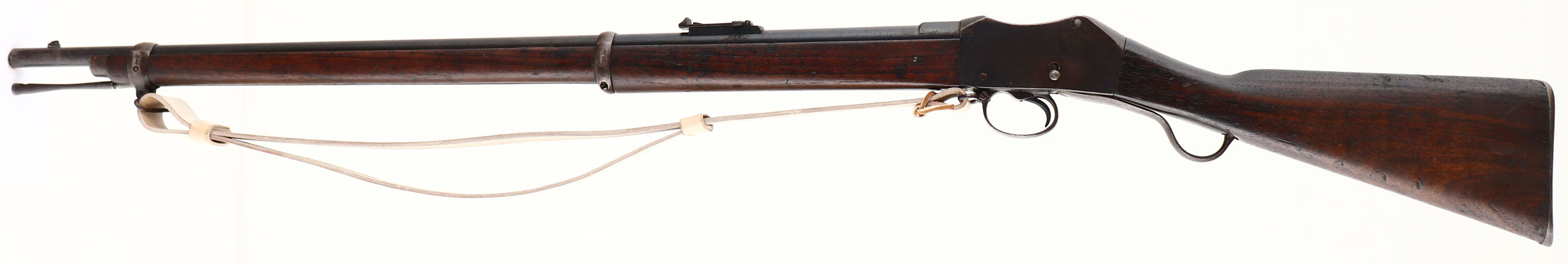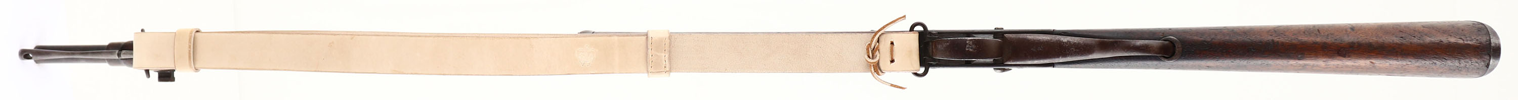 CONDITION: the two piece, straight wrist wood stock is very good with various nicks, dings, dents, scratches & wear from use/age. The buttplate is proud to thew wood at the toe, it was caused by wood shrinkage over the many years. The right cheek of stock is marked with MANY different cartouches, a mix of British & Nepal (please see close up photo of all the markings on the stock). The blued metal finish rates 65% overall with areas toning to a brown patina & rust speckling starting to form. The lever has completely toned to a brown patina. The right side of the receiver is marked with a crown over ''V.R'', ''ENFIELD'', ''1885'', another crown over a downward facing arrow, & ''II.''. The left side of the receiver is stamped with British proof marks. The left & right side of the barrel have many other British proof marks. The left side of the barrel, under the rear sight is marked ''N.S'', ''N E P''. This marking means Native Service, Nepal, & was put on rifles that were going to Nepal straight from British arsenals. The bore is very good. Its bright with a few spots of roughness. The barrel holds a barleycorn front sight with a stepped tangent/ladder, V-notch rear sight marked 100 to 400 on the base & 5 to 13 on the ladder. The stock carries a steel buttplate that's toned to a brown patina. Rifle has both sling loops & has its cleaning rod. Rifles comes with the reproduction, white leather British sling. A very nice example of a double country service Martini-Henry. Antique No FFL Req - Value: 400 to 800