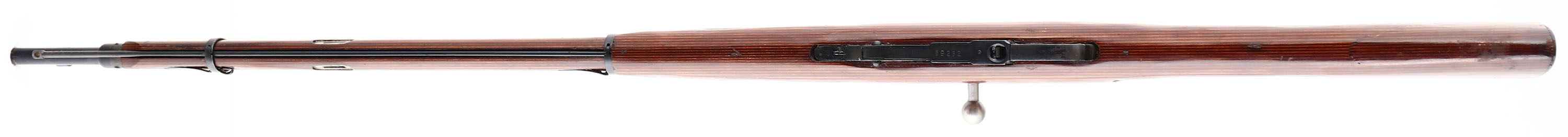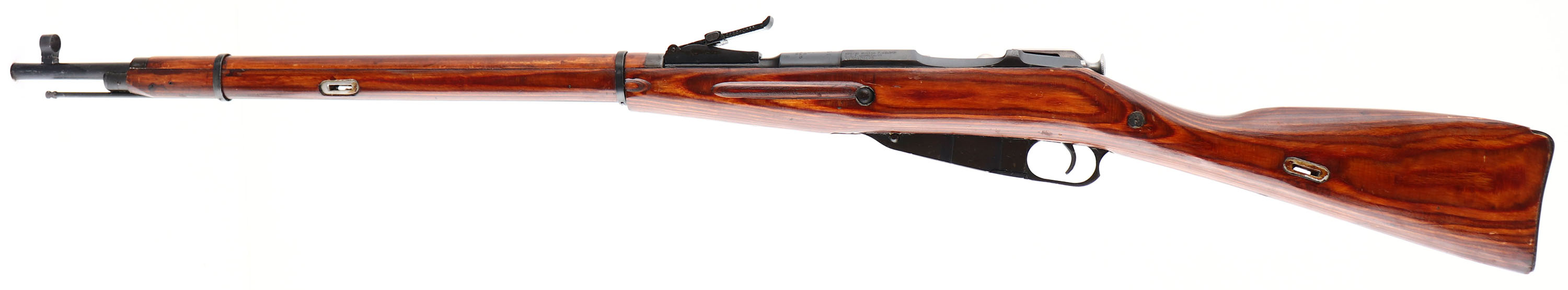 Tula, Model: M91/30 Ex-Dragoon, Cal: 7.62x54mmR, MFG: 1925, S/N: 9130470123 (59252 on barrel), bolt action rifle, 28 1/2'' barrel. The straight wrist, laminated wood stock is excellent as being very lighted sanded & oiled. Stock has a few small nicks, dings, dents, & scratches. Laminated stock were typically used as replacement stock after the war on refurbished rifles, which this rifle appears to have been refurbished after the war. The metal appears to have been re-blued at some point, most likely when is was re-furbished after the war. The Re-blued metal finish rates 95% overall. The top of the barrel is marred with the Tula star with 3 smaller circles around it, has the typical lines of writing in Russian that's found on Tula barrels from 1924-26. FFL or C&R Req - Value: 250 to 500