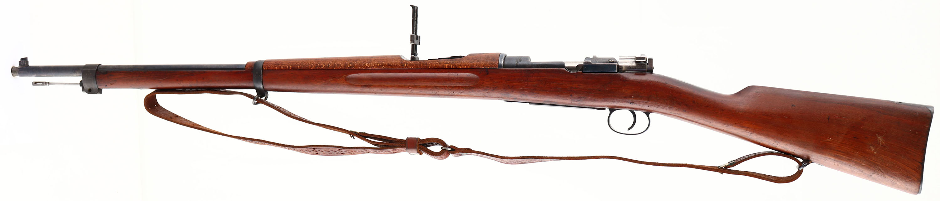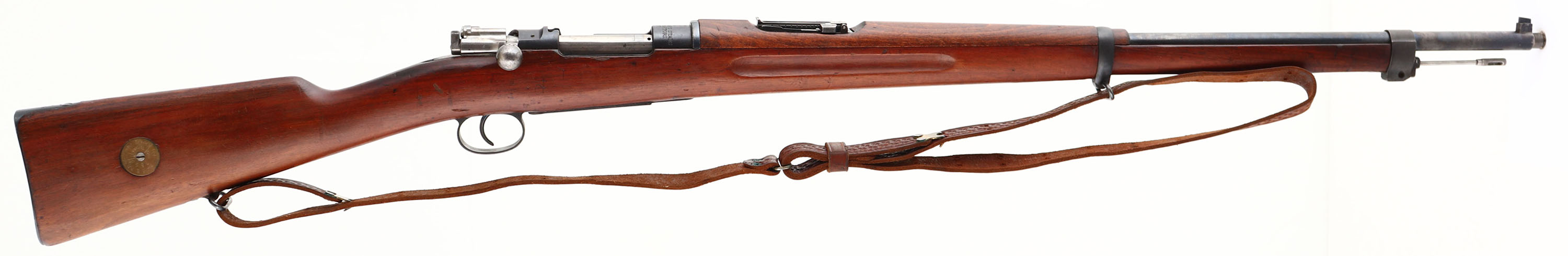 Carl Gustafs Stads Gevarsfaktori, Model: M1896, Cal: 6.5x55mm, MFG: 1917, S/N: 408552, bolt action rifle, 29'' barrel. The straight wrist wood stock is very good with various small nicks, dings, dents, scratches, & wear from use/age. The bottom of the wrist has a crown over ''B'' cartouche. The metal is proud to the wood around the front of the magazine floorplate. The right cheek of the stock has a embedded brass bore disc. The metal finish rates 90% overall with light scratches & areas of light thinning. The top of the receiver is marked with a crown, ''CARL GUSTAFS STADS GEVARSFAKTORI'', ''1917''. The left side of the receiver is marked with the S/N, & ''H.K'' which is the Inspector initials of Kapten, Helge Gustaf Ludvig Kolthoff, who was a Inspection Officer at the Carl Gustafs plant from April 1, 1912 to February 28, 1923, making him the longest serving inspector at the Carl Gustafs plant. The end of barrel stamped with importer marks. S/N matched bolt, magazine floor plate, buttplate, & all other smaller parts other than the cleaning rod. The top rear of the receiver has two holes drilled & tapped for a sight. Bore is excellent near MINT. The barrel holds a squared blade front sight with a stepped tangent/ladder rear sight marked 3 to 6 on top of ladder & 7 to 20 on back of ladder. The stock carries a blued steel buttplate that has light wear around the edges. Rifle has both bottom sling loops, & has its cleaning rod. Comes with a leather M1907 style sling. The Swedish Mauser's are know to be some of the best quality built Mauser's ever made & with the excellent bore this would make a excellent shooter. FFL or C&R Req. - Value: 400 to 800