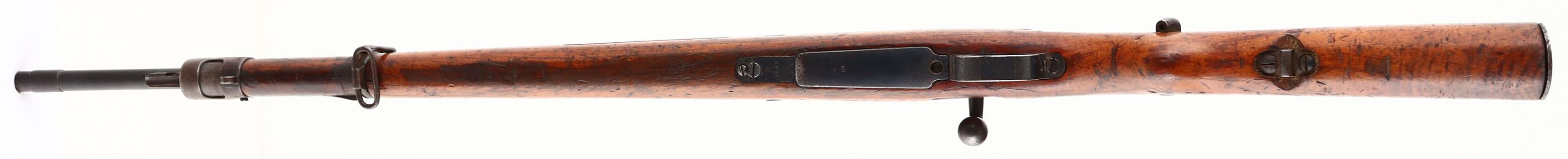 DWM (Mauser Oberndorf), Model: 1908/34 Brazilian Short Rifle, Cal: 7x57mm Mauser, MFG: 1908-1914, S/N: B1005, Bolt action Rifle, 22'' barrel. The semi-pistol grip wood stock is good with numerus, nicks, dings, dents, scratches, vice marks, added oils, & wear from use/age. The stock does not appear to have been sanded but has shrunk in areas from age & metal is proud to the wood around the trigger guard/magazine, & the toe of the buttplate. The blued metal finish is original but rates 40% overall with areas of brown patina & wear. The receiver band is marked with buffed/worn Brazilian coat of arms, with faint remnants around the edges. ''MOD 1908'', S/N, ''DEUTSCHE WAFFEN-UND'', ''MUNITIONSFABRIKEN OBERNDORF AN''. The bore is good. Has a few spots of light pitting & thinned rifling. The barrel holds a barleycorn front sight with a tangent V-notch rear sight marked 2 to 20. the stock carries a steel buttplate with wear & patina. Rifle has both bottom & side sling mount. Rifle is missing its cleaning rod. While the contract for the Brazilian 1908 Rifle was through DWM, they did not make all the rifles. The contracted out some of the rifles to Mauser Oberndorf, which is where this rifle was made. The 1908/34 modification was made later when the stock was replaced by locally made stocks that have finger grooves, the barrel was shortened down to make a short rifle, & the bolt handle was bent. FFL or C&R Req - Value: 250 to 500