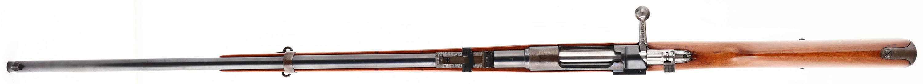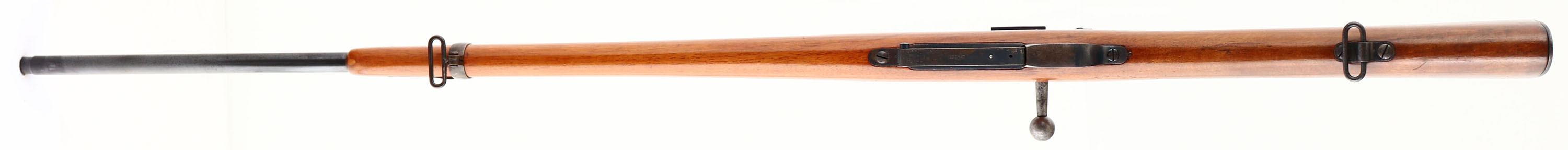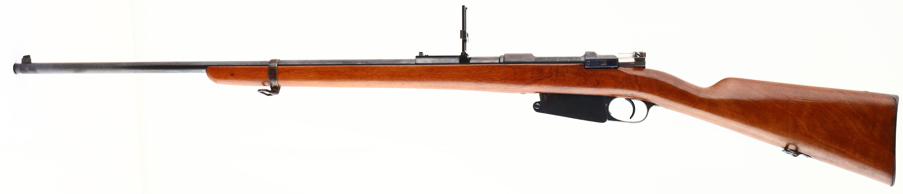 Ludwig Loewe & Co., Model: 1891 Argentine Mauser, Cal: 7.65x53mm Mauser, MFG: 1892, S/N: B9057, Bolt action rifle, 29'' barrel. The straight wrist wood stock is very good as being cut down, shaped in spots, sanded & re-finished. The buttplate is proud to the wood at the toe. The cleaning rod hole has a wood plug fill. There are no visible cartouches on the stock. The blued metal finish on the barrel rates 90% with spotty brown patina forming in spots. The blued metal finish on the receiver rates 70% with gun metal gray & patina where the crest was ground off by the Argentine government, per the agreement of importing them. The other areas of the receiver retain deep, strong bluing. The left side of the receiver is stamped with two proof marks, ''MAUSER MODELO ARGENTINO 1891'', ''MANUFACTURA LOEWE BERLIN''. The right side of the receiver & barrel are stamped with the S/N. the top of the barrel has one proof stamp. All serialized parts are S/N matched to the rifle. The bore is excellent, its bright & mirror like with minimal wear. The barrel holds a barleycorn front sight with a flip up ladder, V-notch rear sight marked 4 to 20 on the ladder. The stock carries a blued steel buttplate. Buttplate has worn mostly gun metal gray with spots of patina. The rifle has both bottom sling mounts. Antique No FFL Req. - Value: 200 to 400