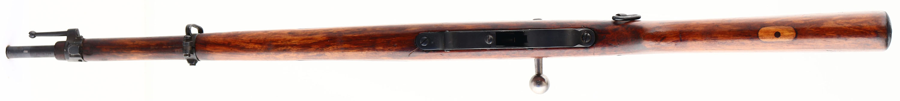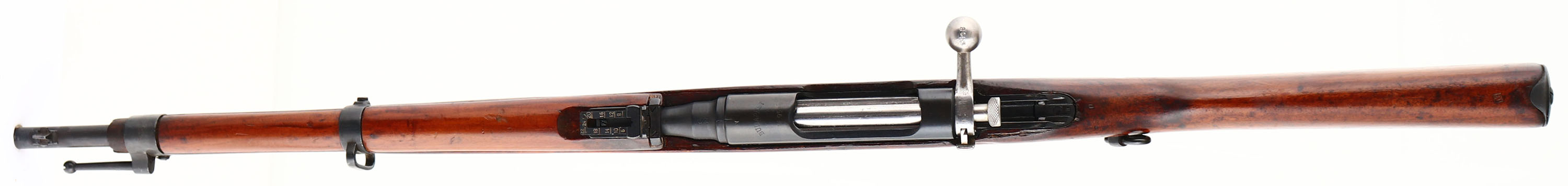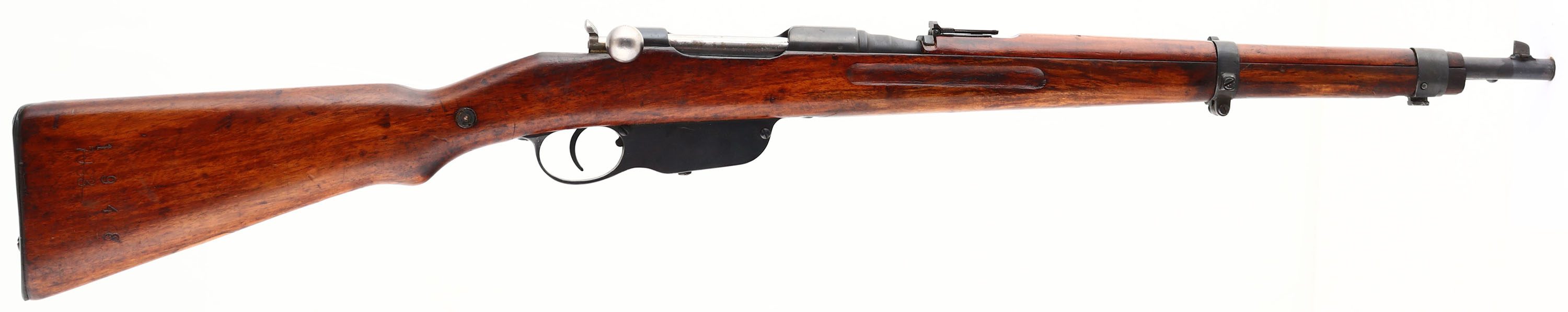 F.G.G.Y. Budapest (Hungarian), Model: M95/30 Repetier-Karabiner Stutzen, Cal: 8x56mmR, MFG: 1897-1918, S/N: 1948F, Straight pull bolt action rifle, 20'' barrel. The semi-pistol grip wood stock is excellent. This stock is a replacement from another rifle that was done when it was re-chambered in the 1930's. The original bottom rear sling swivel has been removed & the hole has a wood plug fill. on the left cheek there is the crossed out S/N of the previous rifle. The right cheek of the rifle has another crossed out number & the new S/N stamped into it. There is a ''0'' stamped into the top of the wrist. The rear of the comb is marked with a ''17'' in a box & a ''20'' in two boxes. The metal was re-blued when it was re-arsenaled & re-chambered in the 1930's, & as such rates 90% with full coverage, just has spots of wear & thinning. The receiver band is marked ''BUDAPEST'', ''M.95''. The left side of the receiver is marked with the S/N. the right side of the receiver is marked with a Prussian eagle proof stamp. All the marking on the receiver are faint from being buffed when it was re-blued. The left side of the barrel is marked with the S/N. the top of the barrel is marked with a ''S'' which means this rifle was re-chambered to 8x56mmR during the 1930's by OE.W.G. Styer, this mark would also be used as a military acceptance mark for the Austrian government in the 30's. the bottom end of the barrel is marked with import stamps. The bore is excellent. The barrel holds a tall barleycorn front sight, with a flip up ladder, V-notch rear sight marked 6 to 24. the stock carries a blued steel buttplate. Rifle has both side sling mounts. A very nice example of a M95/30 straight pull rifle that was originally a carbine, not a ling rifle that was cut down. FFL or C&R Req. - Value: 300 to 600