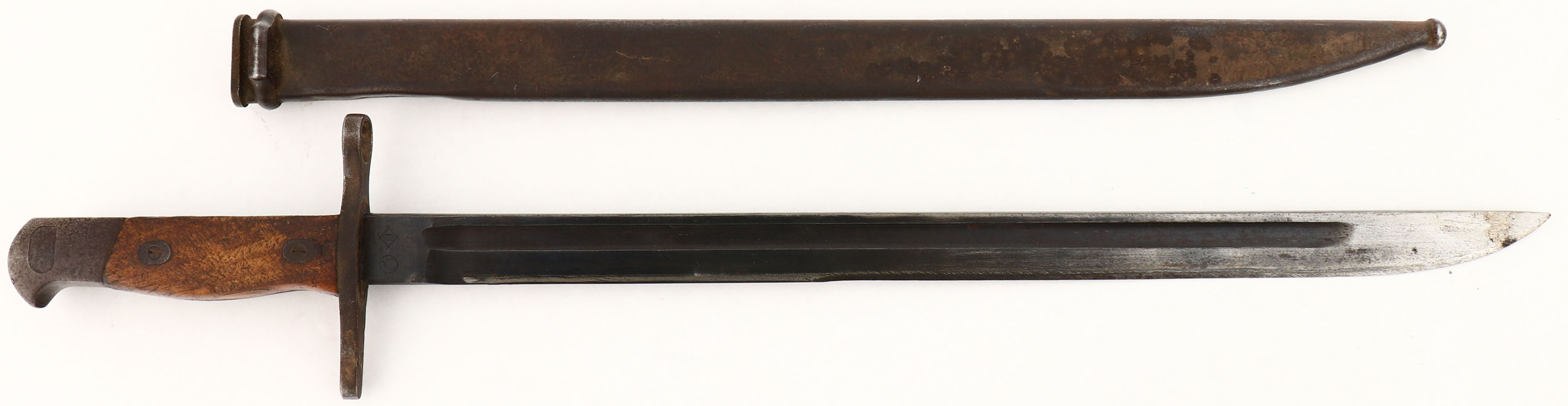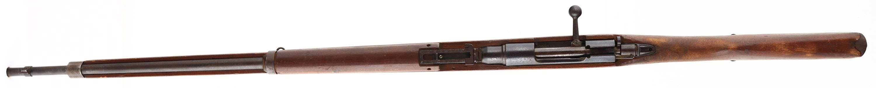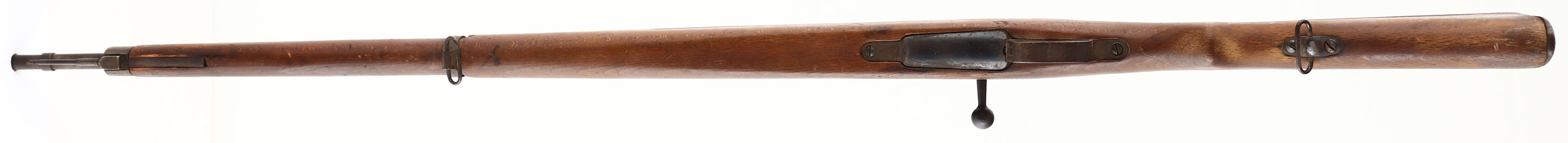 Fabrica Nationale D'Armi Di Brescia, Model: Type I Rifle, Cal: 6.5x50mmR, MFG: 1938-39, S/N: H999, Bolt action rifle, 31'' barrel. The consigner states that this is a vet bring back rifle from WW2 and it came back with the bayonet & sling. The semi-pistol grip wood stock is very good as being lightly sanded & oiled. There are no visible cartouches on the stock. The rear barrel band retention spring is missing. The blued metal finish on the barrel has toned mostly to a brown patina with spots of original blue showing in spots. The blued metal finish on the receiver rates 60% with spots of deep original blue & spots of speckled brown patina. The only marking on the rifle is the S/N on the left side of the barrel. The bore is very good. Its beginning to darken with strong rifling. Barrel holds a barleycorn front sight with a ladder V-notch rear sight marked 5 to 24. the stock carries a steel buttplate, that's toned to a brown patina with spots of rust. The rifle has both bottom sling loops & has its cleaning rod. Rifle comes with a Toyoda Jidoshoki Seisakusho, under Nagoya supervision, type 30 bayonet & a leather type 38 Sling that has Japanese markings. Italian made rifle for the Japanese navy, made between 1938-39. these were made because all rifle manufactures in Japan were tied up making rifles for the army. Uses the Carcano action but everything else is like a type 38 Arisaka. FFL or C&R Req. - Value: 150 to 300