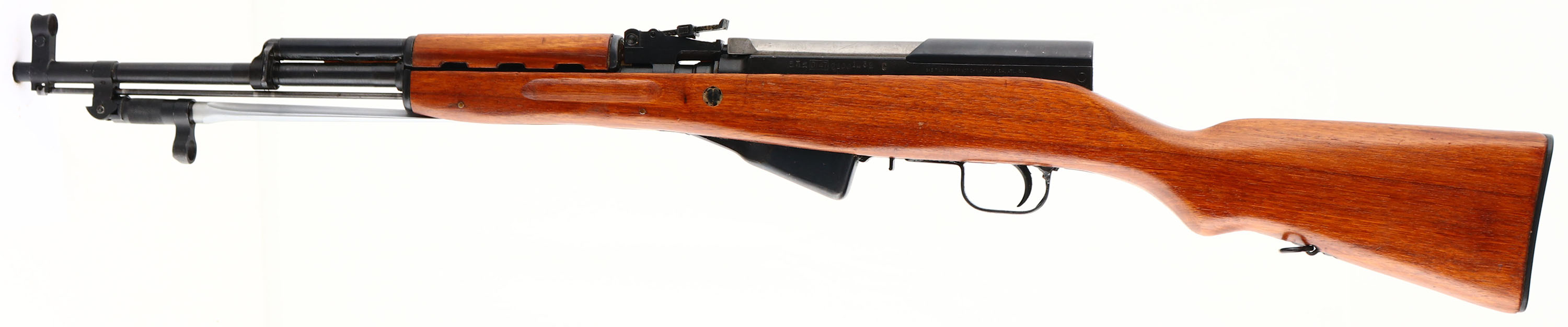 Chinese Factory 0147, Model: Type 56, Cal: 7.62x39, MFG: 1976, S/N: 21001432, Semi-auto Rifle, 20 1/2'' Barrel. The semi-Pistol grip wood stock is excellent with little to no wear, Chinese lettering in circle cartouche on bottom of stock behind wrist. The metal finish rates 98% on the barrel, & rates 95% on the receiver with minor scratches, still has original grease (Cosmoline) from the factory inside the action & in between the barrel & gas tube. Left side of receiver is marked with ''TYPE 56 CARBINE'' in Chinese, ''0147'' in rectangle factory stamp, S/N, ''C'', & importer marks, Bolt & magazine are S/N matched. Bore is Excellent, bright & mirror like. Hooded post front sight, tangent U-notch rear sight marked 1 to 10. Steel trapdoor Butt plate with full cleaning kit inside, Butt plate has scratches & wear. One bottom & one side sling mount. FFL Req. - Value: 400 to 800