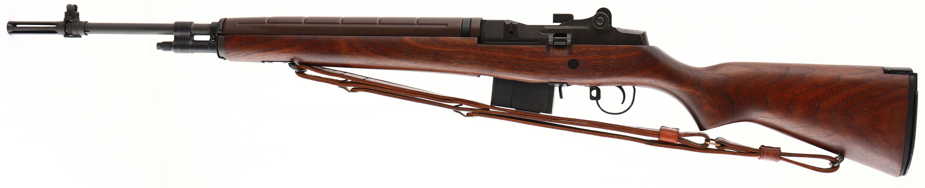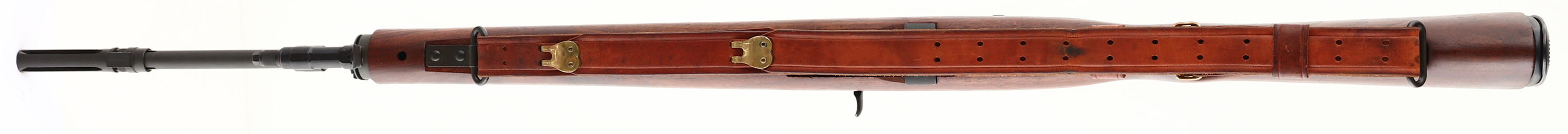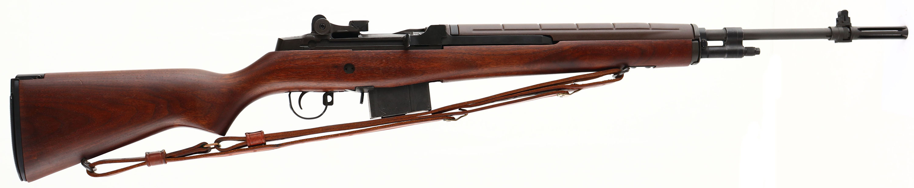 Springfield Armory, Model: M1A, Cal: .308 Win, MFG: Modern post 2000, S/N: 245705, Semi-auto rifle, 22'' barrel. The semi-pistol grip, black walnut stock is excellent with only a few minor nicks, dings, & dents. The parkerized metal finish rate 97% overall with minimal wear. The rear of the receiver is marked ''US RIFLE M1A'', ''SPRINGFIELD'', ''ARMORY'', & the S/N. the top of the bolt is marked with a drawing number. The bore is MINT, appears brand new. The barrel holds a blade front sight with protective wings. The rear of the receiver holds a windage & elevation adjustable, aperture rear sight. The stock carries a black parkerized steel, checkered, trapdoor buttplate, with a flip up shoulder rest. There is nothing inside the trapdoor. Rifle has both bottom sling loops. Rifle comes with a leather M1907 style sling. & the one magazine that its photographed with. A very nice, classic Springfield M1A. FFL Req. - Value: 1300 to 2600