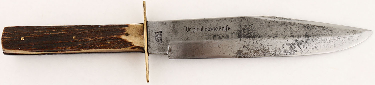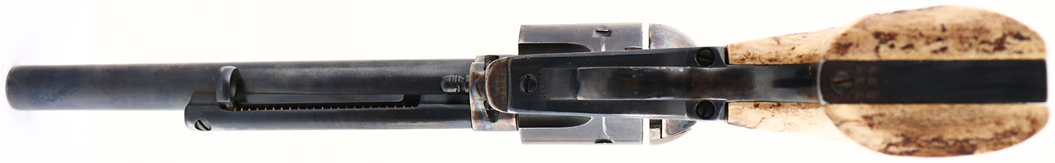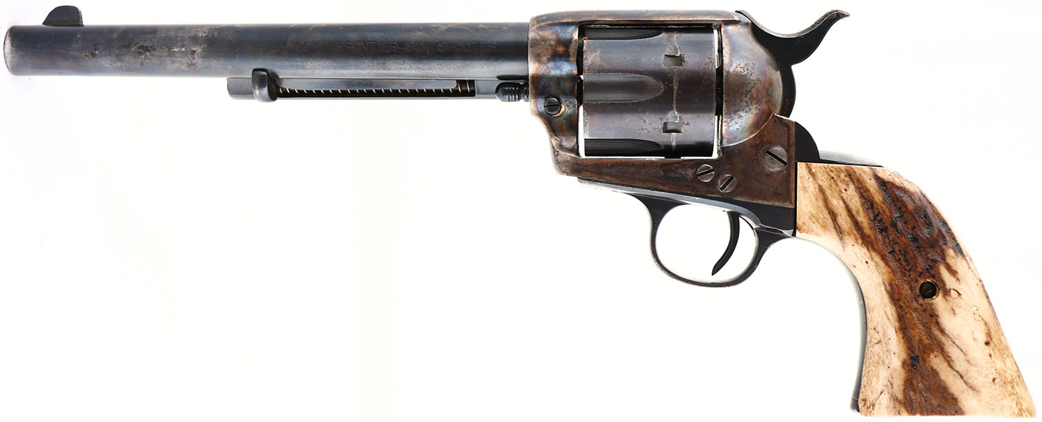 UNIQUE SET, Colt, 1873 Frontier Six Shooter, CAL: 44-40 WCF, MFG: 1902, SN: 232699, Single Action Revolver, 7 1/2'' barrel. The top of the barrel is marked ''COLT'S PT F.A MFG CO HARTFORD CT. U.S.A.''. The left side of the barrel is marked ''COLT FRONTIER SIX SHOOTER''. The left side of the frame is marked with the standard Colt patent dates. All matching SN on the frame, trigger guard & butt. This revolver was refinished at one time. The Stag horn grips are excellent, with nice figure & color. The reblued metal finish on the barrel rates 60%, with areas of thinning toned to a brown patina. The case-hardened frame retains faded, but visible case-colors. The trigger guard rates 95% & the cylinder rates 80%. There is intermittent rust spotting throughout the metal surfaces. Bore is good, with consistent roughness & light pitting. Integral small notch rear sight & blade front sight. This pistol is accompanied by a Tooled Money Belt circa 1890-1910 with loops for 44-40 (marked 44-40). The belt carries a Montgomery & Ward Co. ''Horse & Rider'' holster made circa 1915-25 & a well-made custom vintage knife sheath that holds an Edge Brand - Original Bowie Knife with Stag horn grips, made in Solingen Germany. A very unique & well compiled set. FFL or C&R Req. - Value: 3000 to 5000