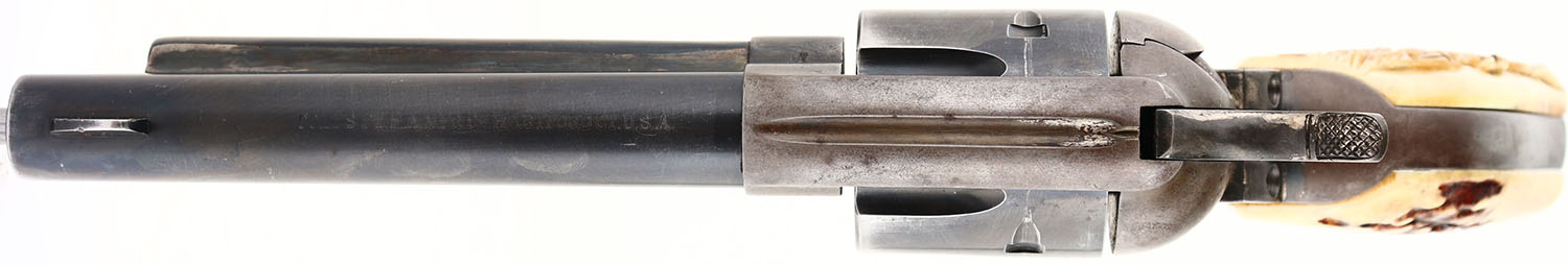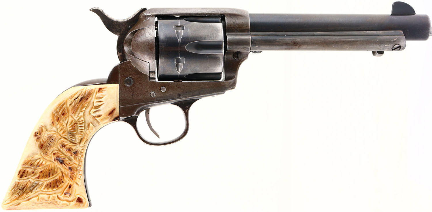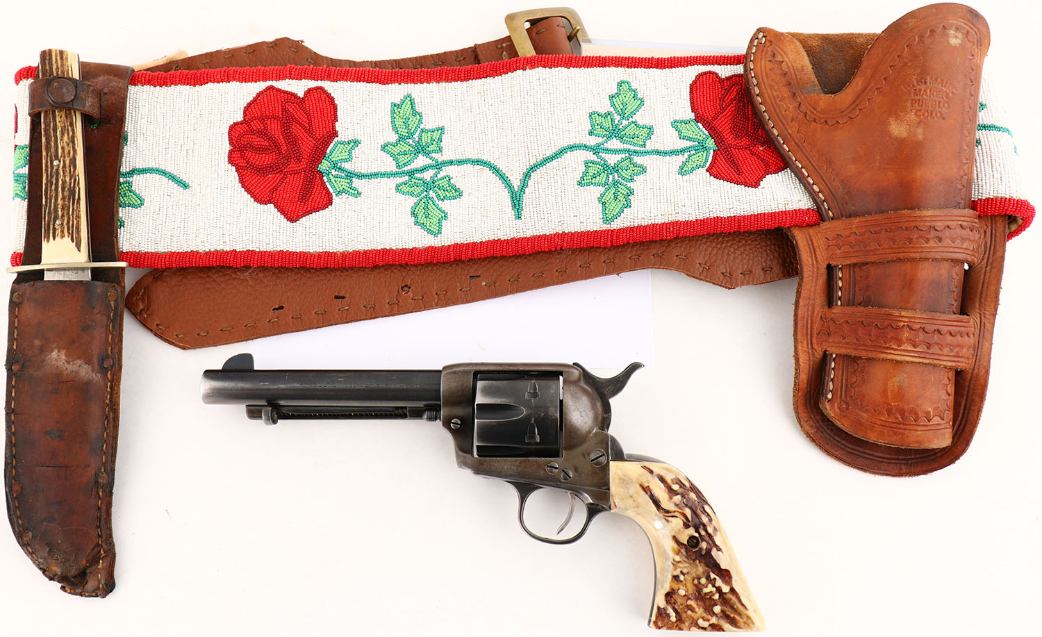 UNIQUE SET, Colt, 1873 Single Action Army, CAL: 45 COLT, MFG: 1899, SN: 182116, Single Action Revolver, 5 1/2'' barrel. The top of the barrel is marked ''COLT'S PT F.A MFG CO HARTFORD CT. U.S.A.''. The left side of the barrel is marked ''COLT SINGLE ACTION ARMY .45''. The left side of the frame have the standard patent dates & the circled Rampant Colt logo, with the left side of the circle worn thin. All matching SN on the frame, trigger guard & butt. The Stag grips with carved eagle & high gloss finish are excellent. The metal blue finish on the barrel rates 85%, with visible thin brush lines & concentrated loss on the ejector rod housing & muzzle from holster wear. The cylinder rates 80%, with visible thin brush lines & concentrated wear to the front edges from holster wear. The case-hardened frame has worn to metal gray & toned to a brown patina. The trigger guard has also worn to metal gray & toned to a brown patina, with blue remaining in protected areas. Bore is excellent. Integral v-notch rear sight & dorsal fin blade front sight. This gun is accompanied by an Indian Beaded Belt circa 1890's, it is 4'' wide, with white body, red border & four roses, all made up of red, white & green seed beads. Star Conchos border each end of the beads. The belt carries a holster marked ''R.K. MAUK MAKER PUEBLO COLO.'' & an unmarked knife sheath that holds a Original Bowie knife with stag grips, by Anton Wingen Jr., Solingen Germany, stamped ''OTHELLO''. The blade has intermittent spotting. Another unique set that presents wonderfully. Antique, No FFL Req. - Value: 1500 to 3500