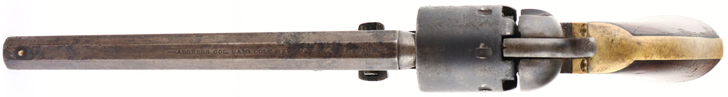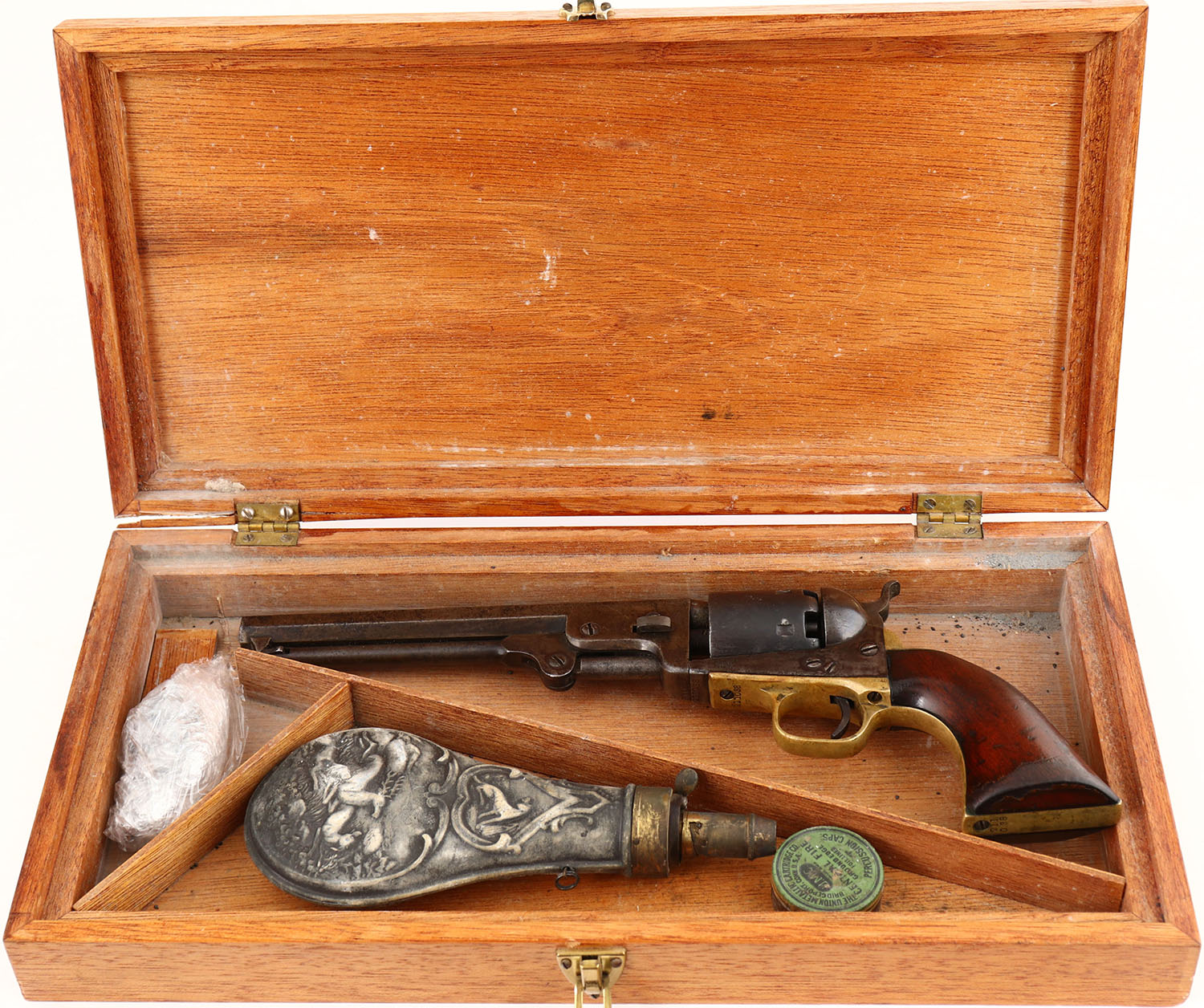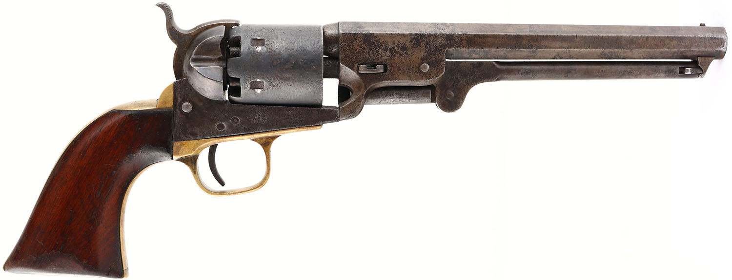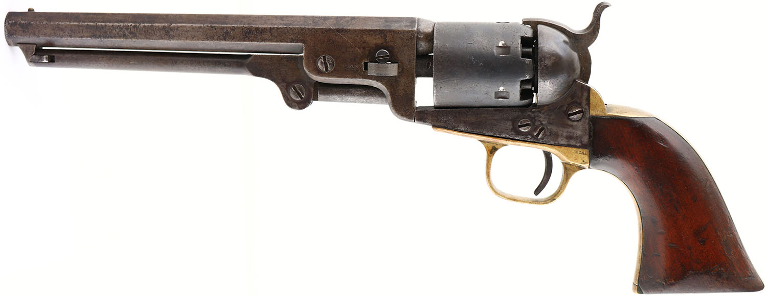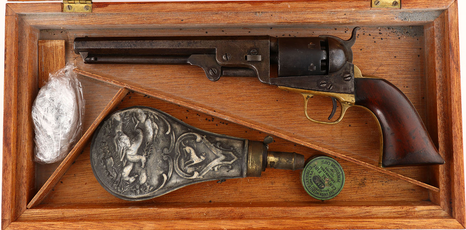 Colt, 1851 Navy - 4th Model, CAL: 36, MFG: 1870, SN: 211038, Single Action Revolver, 7 1/2'' octagon barrel. The top of the barrel is marked ''ADDRESS COL SAM L COLT NEW YORK U.S AMERICA''. The left side of the frame is marked ''COLT'S PATENT''. The caliber marking can be seen on the right side of the trigger guard. All matching SN. The original wood grips are very good & solid, having been lightly sanded & refinished. The bottom front corner of the left grip & top front edge have small edge chips, along with smoothed contusions & scrapes under the finish. The metal blue finish has fully worn to a mix of metal gray & brown patina, with consistent cleaned pitting throughout. The case-hardened frame has shadows remaining from case-colors &has worn to a mix of metal gray/brown patina. The brass trigger guard has an aged patina. The cylinder has worn smooth, with remnants of the patent no. mark. Bore is fair, with consistent pitting amongst strong rifling. Small hammer notch rear sight (when cocked) & small brass bead front sight. Comes in a custom wood case, with a partially full powder tin, appx 25 round balls & a small tin of percussion caps. The bottom left of the lid is cracked where it's attached to the hinge, otherwise very good. Antique, No FFL Req. - Value: 1000 to 1500