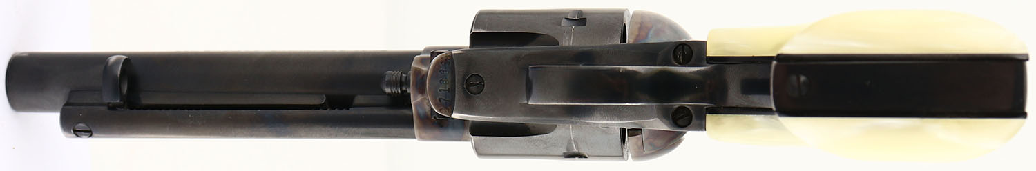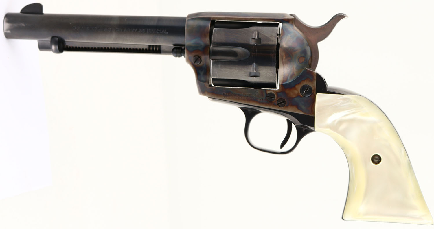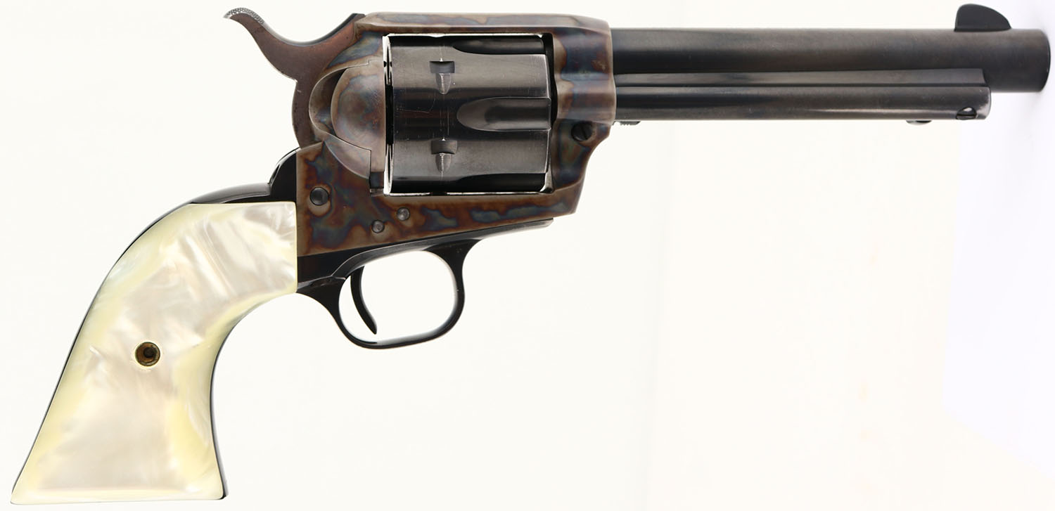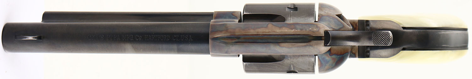 Colt, Single Action Army - Early 2nd Gen, CAL: 38 SPL, MFG: 1959, SN: 27166SA, Single Action Revolver, 5 1/2'' barrel. The faux pearl grips are excellent. The metal blue finish on the barrel cylinder, & trigger guard rates 97%. The case-hardened frame displays excellent case-colors. Bore is excellent. Integral square notch rear sight & dorsal fin front sight. A nice example of an early 2nd Gen SAA. FFL or C&R Req. - Value: 1500 to 2200