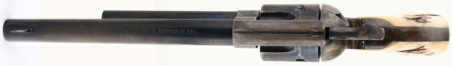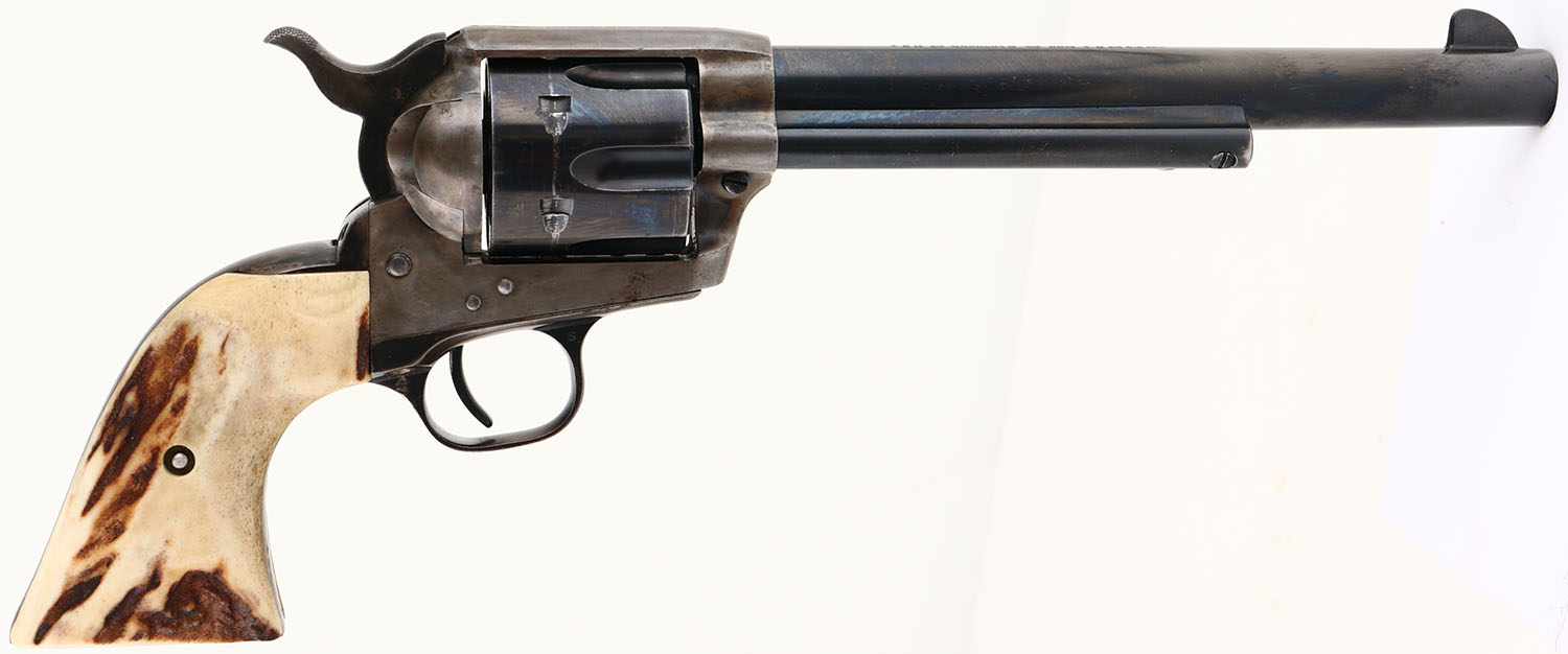 Colt, Single Action Army - Early 2nd Gen, CAL: 45, MFG: 1960, SN: 31509SA, Single Action Revolver, 7 1/2'' barrel. The authentic Stag grips are excellent. The metal blue finish on the barrel rates 97%, cylinder 85% & the trigger guard has worn to a mix of remaining blue, metal gray & brown patina. The case-hardened frame has worn to metal gray & a thin brown patina, with case-colors remaining in heavily protected areas. Bore is excellent. Integral square notch rear sight & dorsal fin front sight. FFL or C&R Req. - Value: 900 to 1500