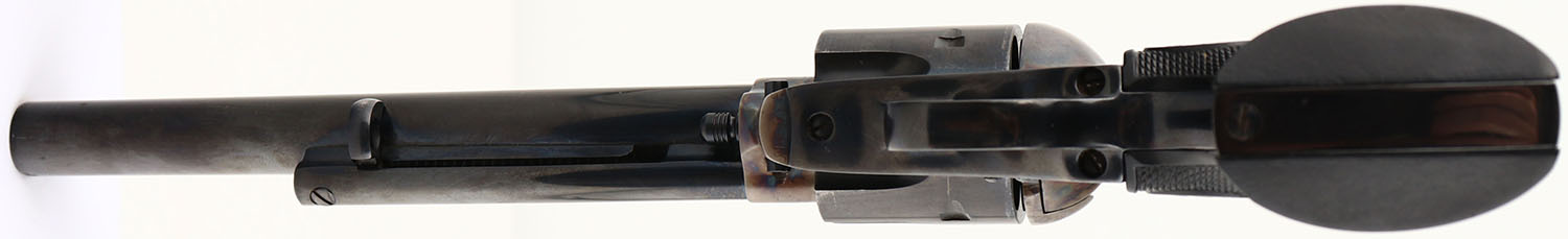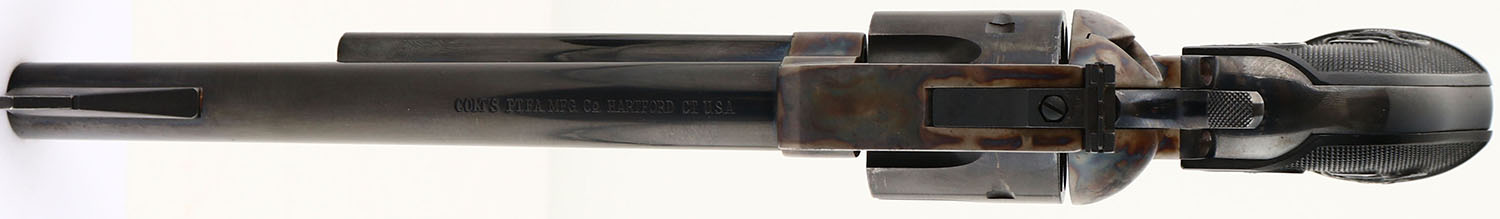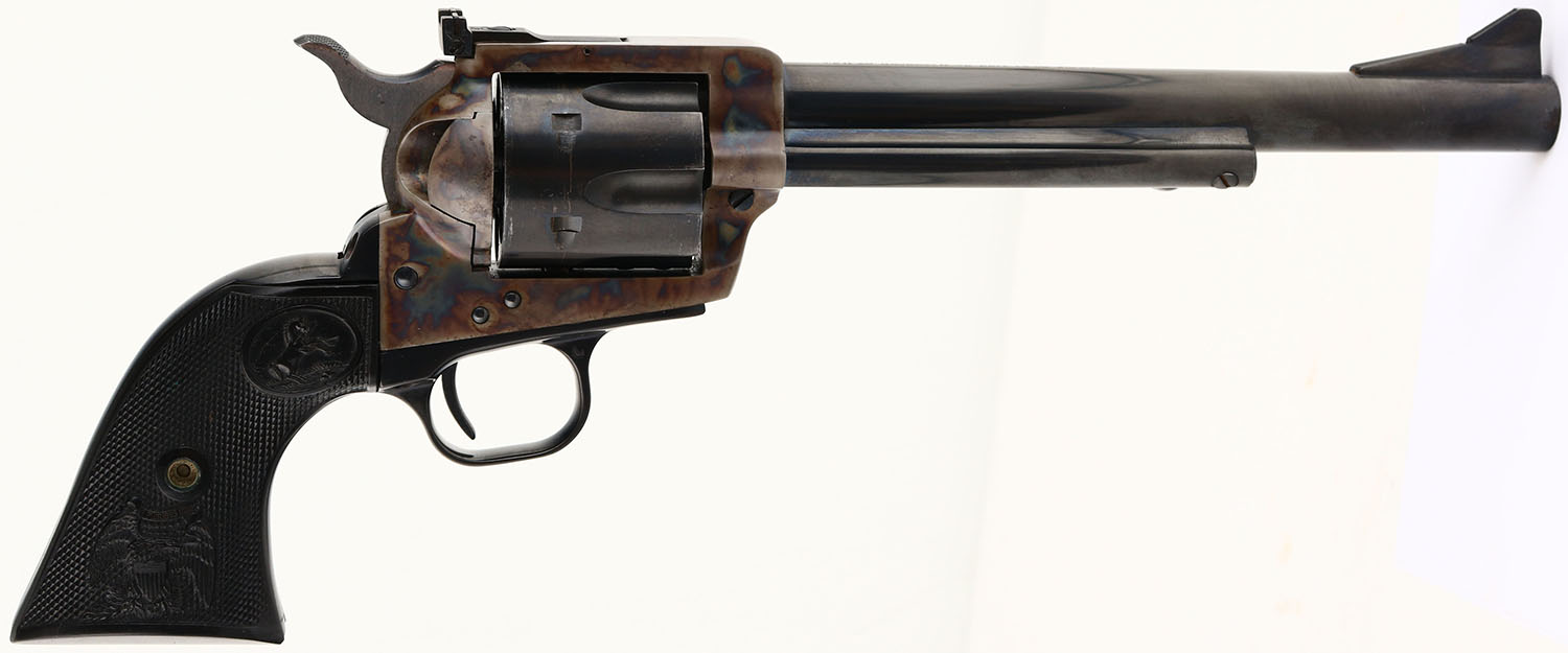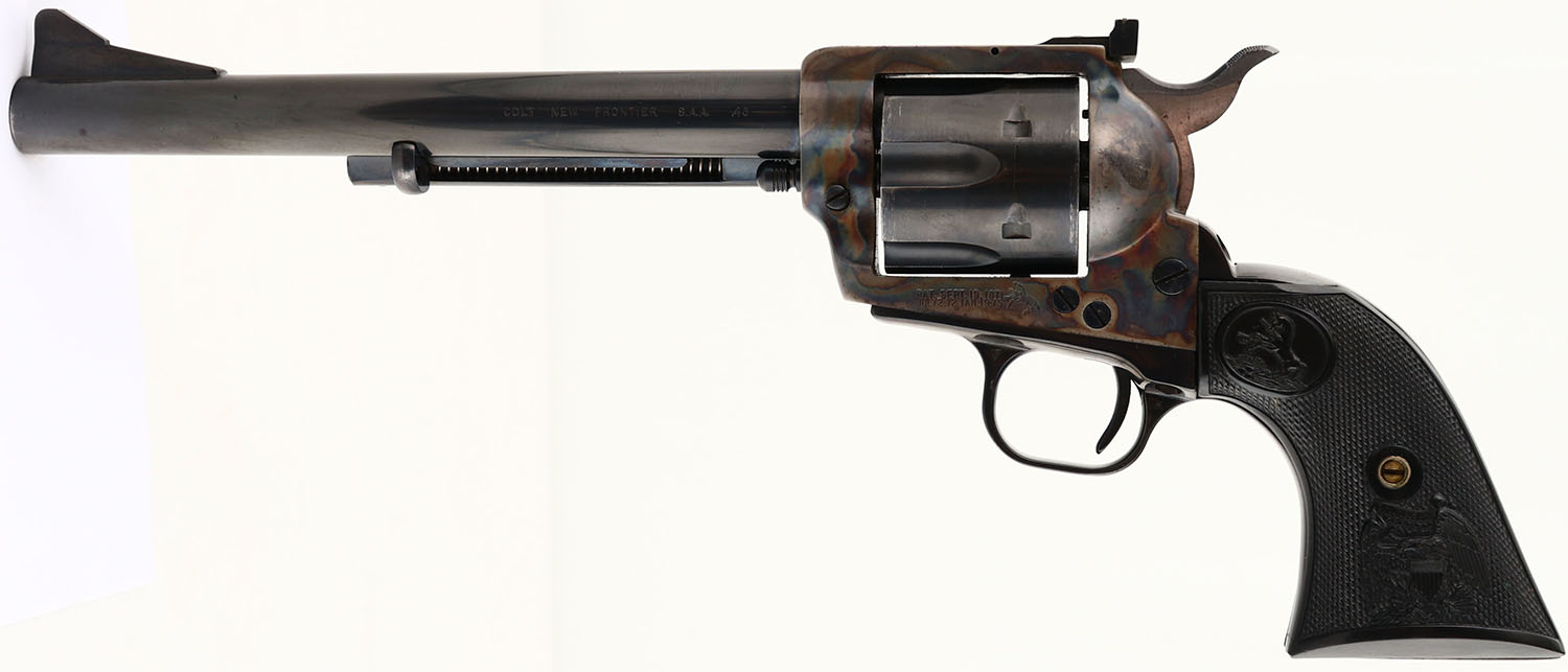 Colt, New Frontier SAA - 3rd Gen, CAL: 45 LC, MFG: 1978, Sn: 01066NF, Single Action Revolver, 7 1/2'' barrel. The E.Pluribus Unum & Rampant Colt checkered hard rubber grips are excellent. The metal blue finish on the barrel rates 98%, cylinder 85%, & trigger guard 99%. The case-hardened frame retains excellent case-colors. Bore is excellent. Adjustable rear sight & ramp elevated blade front sight. FFL Req. - Value: 1000 to 1500