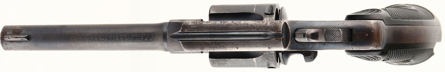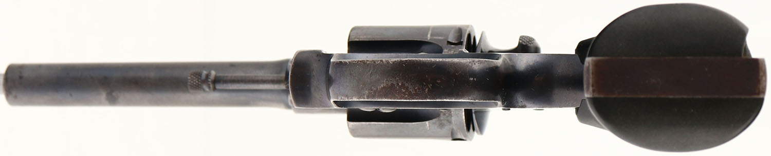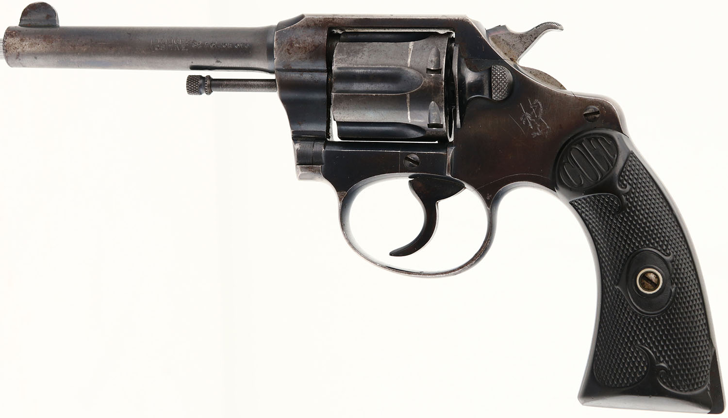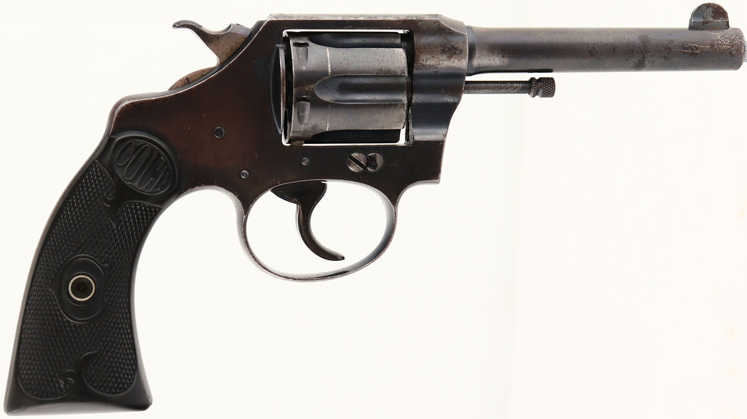 Colt, Police Positive 1st Issue, CAL: .32 Police Ctg, MFG: 1919, SN: 155866, Double Action Revolver, 4'' barrel. The Colt checkered hard rubber grips are very good, with minor handling marks & dings. The bottom rear corner of the left grip has a decent edge chip. The metal blue finish on the barrel rates 85%, with concreated wear & pitting at the muzzle. The frame & trigger guard rates 70%, with areas worn to metal gray & toned to a brown patina. Bore is good & bright, with intermittent pitting. Integral U-notch rear sight & blade front sight. FFL or C&R Req. - Value: 200 to 400