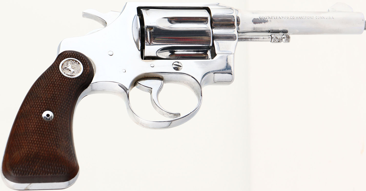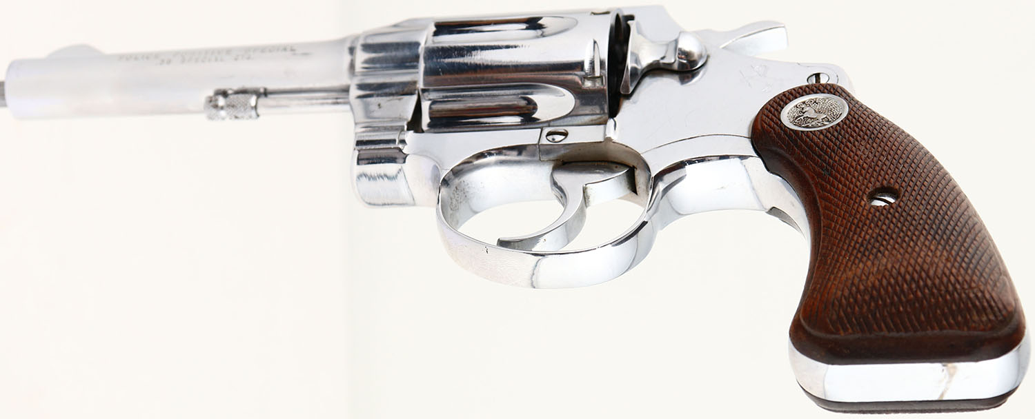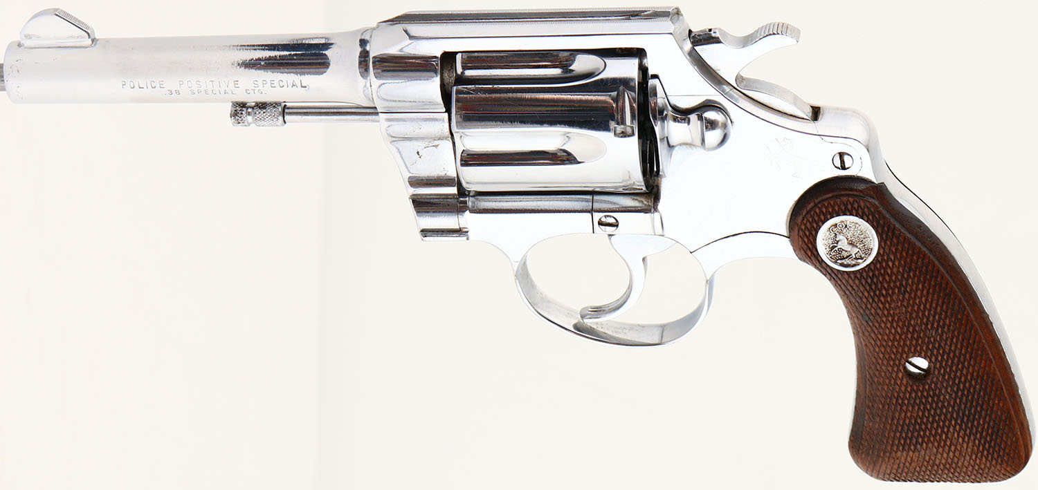 Colt Police Positive Special - 3rd Issue, CAL: 38 SPL, MFG: 1959, SN: 736360, Double Action Revolver, 4'' barrel. The Colt logo medallion grips are excellent, with minor scrapes & dings. The nickel finish is excellent, rating appx 98% overall, with visible brush/polishing lines throughout. Bore is excellent, with frosting in the creases of the lands & grooves. Integral square notch rear sight & serrated blade front sight. A nice example of a nickeled 3rd Issue Police Positive Special. FFL or C&R Req. - Value: 500 to 800