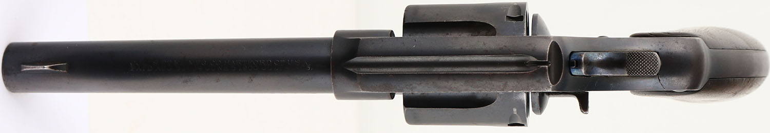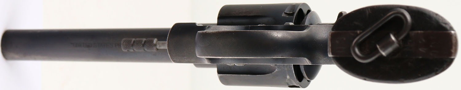 Colt, New Service Model 1909 Army Model, CAL: 45 LC, MFG: 1910, SN: 42000, Double Action Revolver, 5 1/2'' barrel. The original wood grips are excellent, with overall light wear from age & use. The original arsenal refinish rates 85% on the barrel, with holster wear & 80% on the frame/trigger guard with concentrated wear to the top/front/back straps, toned to a brown patina. The bottom of the barrel is marked ''UNITED STATES PROPERTY'', the left side of the barrel is marked ''COLT D.A. 45'', the top of the barrel has standard address/patent dates. The left side of the frame is marked with the Rampant Colt logo intertwined with a ''C''. The right side of the frame is marked ''R.A.C.'' above the grip & ''F.B'' is stamped above the cylinder guard. The butt is marked ''U.S ARMY MODEL 1909 NO 42000''. Bore is good & bright, with consistent roughness & intermittent pitting. Integral u-notch rear sight & dorsal fin blade front sight. Lanyard loop present. Comes with a Colt Factory Letter, confirming the configuration & date of the revolver. FFL or C&R Req. - Value: 1900 to 2900