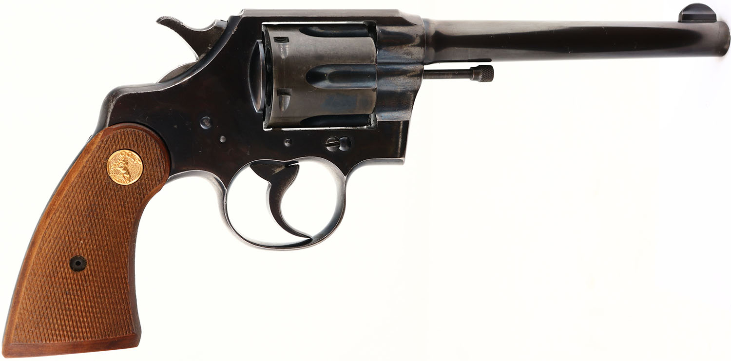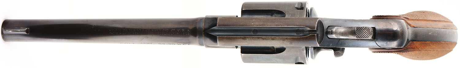 Colt, Army Special, CAL: 32-20 WCF, MFG: 1923, SN: 498178, Double Action Revolver, 6'' barrel. The replaced Colt logo medallion checkered wood grips are excellent. The reblued metal finish on the barrel rates 97%. The original metal blue finish on the frame & trigger guard rates 85% & the cylinder has mostly worn to a mix of metal gray & brown patina, with blue remaining in the fluted areas. Bore is excellent, with some frosting/haze. Integral notch rear sight & blade front sight. FFL or C&R Req. - Value: 300 to 600