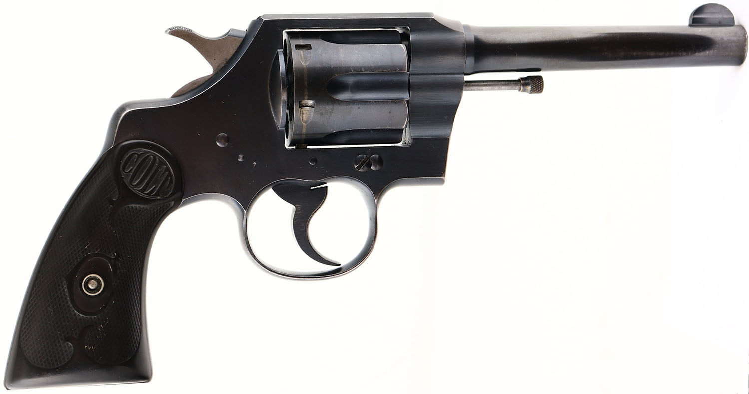 Colt, Army Special, CAL: 32-20 WCF, MFG: 1927, SN: 589611, Double Action Revolver, 5'' barrel. The Colt checkered hard rubber grips are good. The bottom front corner of the left grip has a sizeable edge chip, along with smoothed checkering on both grips. The metal blue finish rates 90% on the barrel & 95% on the frame/trigger guard. There are visible buff lines on the right side of the frame. Bore is excellent. Integral square notch rear sight & blade front sight. FFL or C&R Req. - Value: 400 to 800