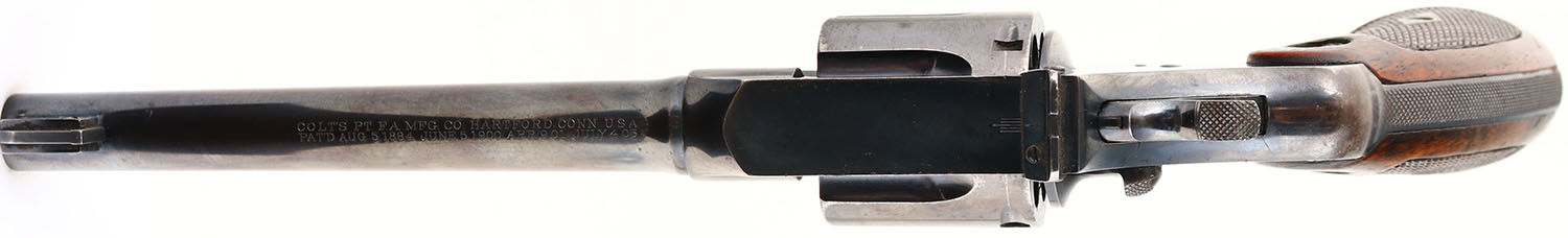 Colt, Officers Model - 2nd Issue, CAL: 38, MFG: 1915, SN: 405151, Double Action Revolver, 6'' barrel. The Colt logo medallion checkered wood grips are excellent. There is light overall wear, with contusions & scrapes. The original high-luster metal blue finish rates 75% on the barrel, with holster wear, scratches & spotting toned to a brown patina. The frame & trigger guard rates 85%, with a few small areas worn to metal gray. Bore is very good & bright, with intermittent light pitting. Adjustable rear sight & adjustable pinned blade front sight. FFL or C&R Req. - Value: 500 to 900