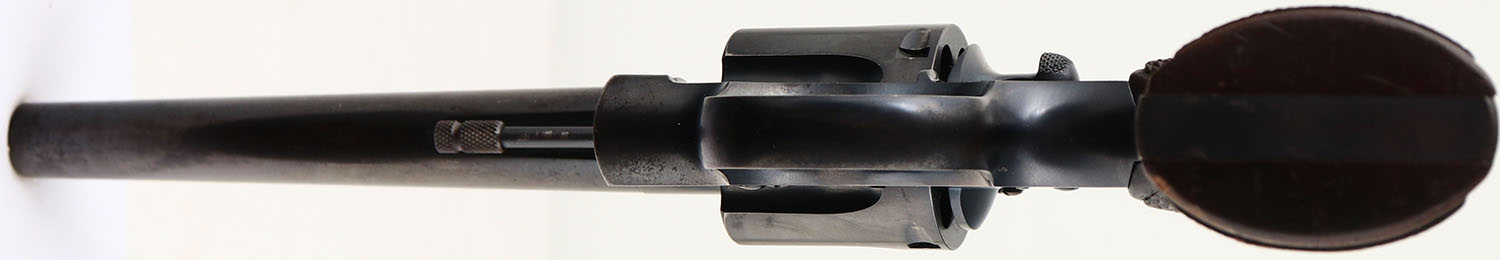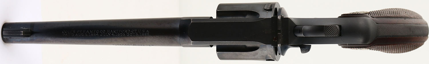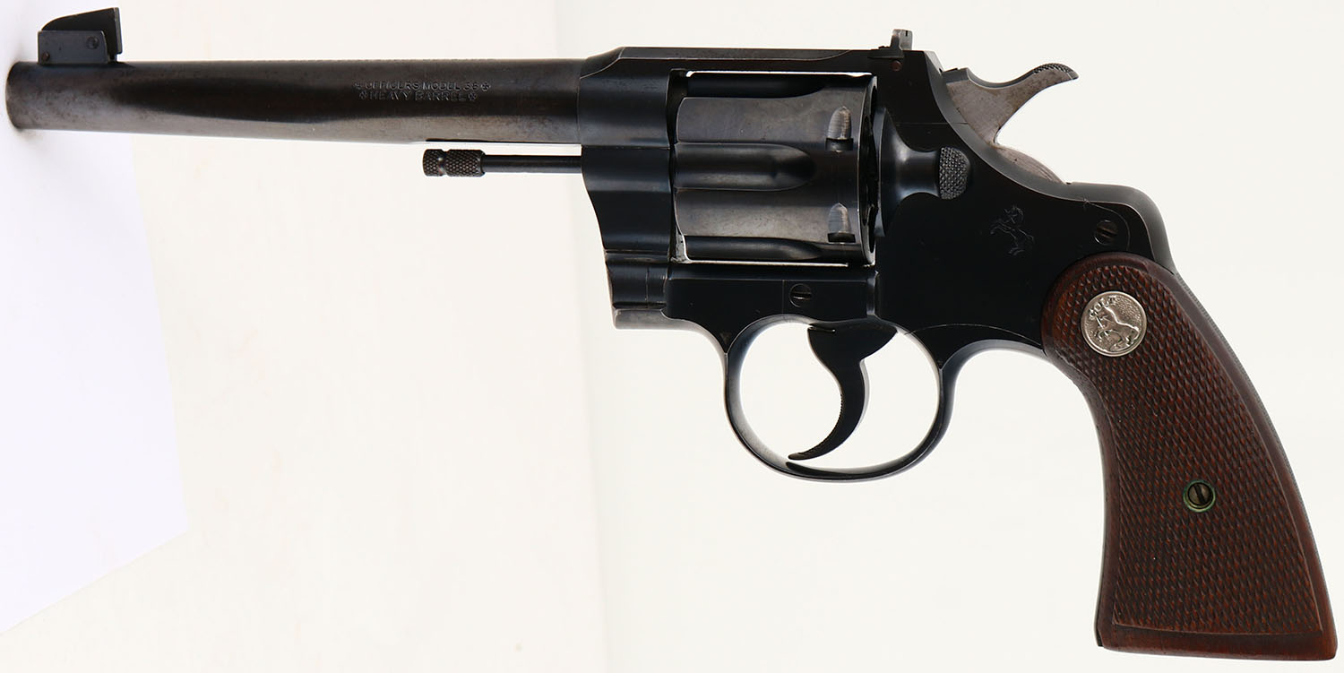 Colt, Officer's Model Target - Heavy Barrel, CAL: .38, MFG: 1935, SN: 597062, Double Action Revolver, 6'' barrel. The Colt logo medallion checkered wood grips are very good & solid. There is light overall wear, & the bottom front corner of the left grip has a small edge chip, along with the butt of the right grip having a noticeable scrape/edge chip. The metal blue finish on the barrel rates 50%, with consistent rust speckling throughout. The frame & trigger guard rates 95%, with rust speckling on the front/top of the frame & trigger guard. Bore is excellent. Adjustable rear sight & adjustable front sight. FFL or C&R Req. - Value: 600 to 1000