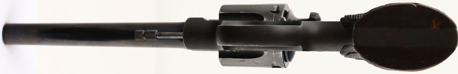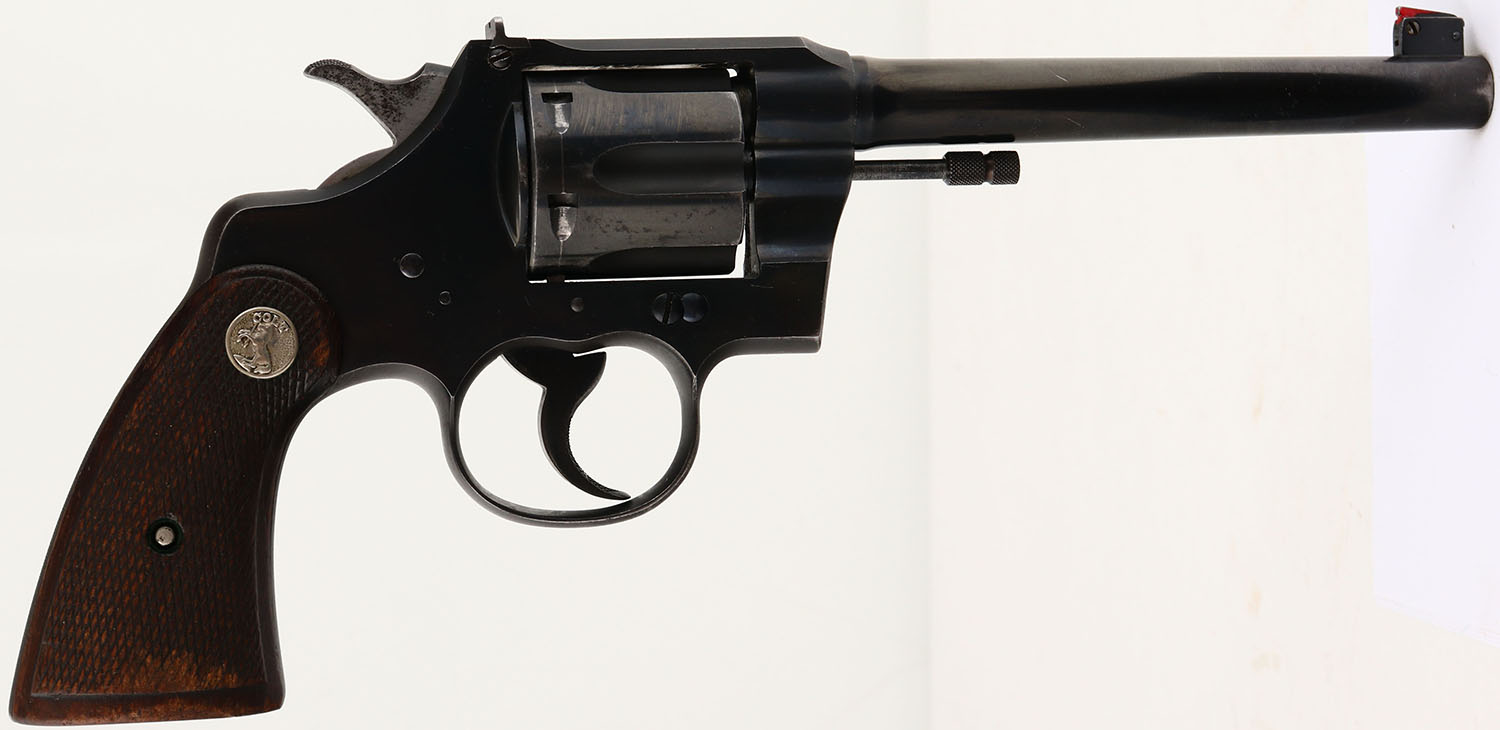 Colt, Officer's Model Target, CAL: .22LR, MFG: 1933, SN: 7677, Double Action Revolver, 6'' barrel. The Colt logo medallion checkered wood grips are very good & solid. There are nicks, dings, scrape & smoothed checkering. The original metal blue finish rates 85% on the barrel, 90% on the high-luster blue parts of the frame & the matte top/back/front strap have spotting & have toned to a brown patina. Cylinder rates 80%, with intermittent rust speckling. Bore is excellent, with consistent frosting/haze. Adjustable rear sight & adjustable pinned red blade front sight. FFL or C&R Req. - Value: 500 to 1000