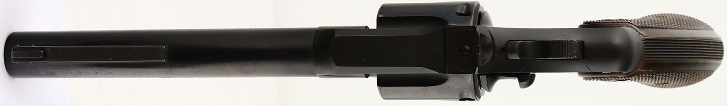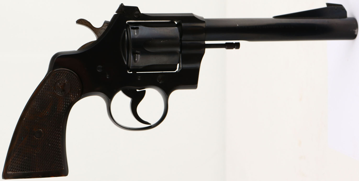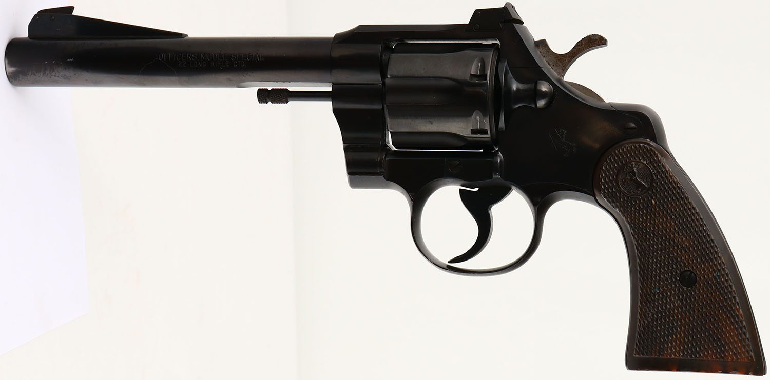 Colt, Officer's Model Special, CAL: 22LR, MFG: 1951, SN: 62833, Double Action Revolver, 6'' barrel. The Colt logo medallion checkered plastic grips are excellent. The metal blue finish rates 95% overall on the areas with high-polish blue. The matte top/back/front strap have consistent spotting/speckling, toned to a brown patina. The sides of the hammer has toned to a brown patina. Bore is excellent, with minor visible wear. Coltmaster adjustable rear sight & ramp elevated serrated pinned blade front sight. FFL or C&R Req. - Value: 500 to 1000