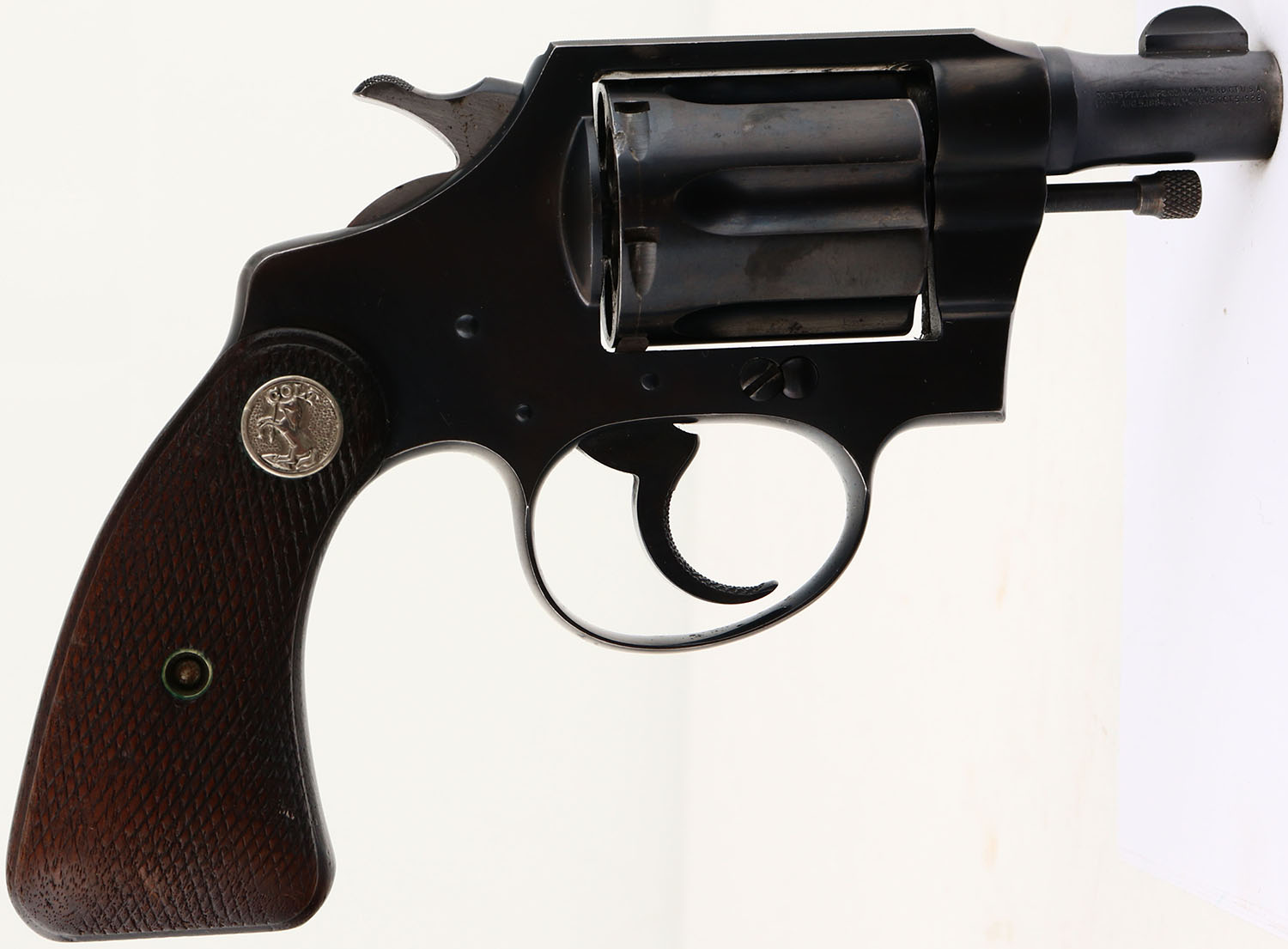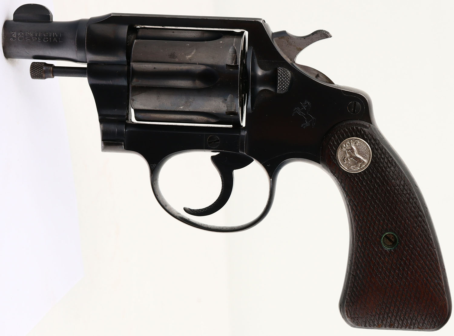 Colt, Detective Special - 1st Issue, CAL: 38 SPL, MFG: 1934, SN: 432170, Double Action Revolver, 2'' barrel. The Colt logo medallion checkered wood grips are very good. There is overall wear from use & age, with nicks, dings & areas of checkering beginning to wear smooth. The metal blue finish on the barrel rates 95%, with wear at the muzzle. The frame rates 95%, with edges worn to metal gray & intermittent speckling. The trigger guard rates 80%, with concentrated wear to the back strap & spotting/speckling around the trigger. The cylinder also rates 80%, with holster wear & a couple areas of spotting worn to metal gray & toned to a brown patina. Integral square notch rear sight & blade front sight. FFL or C&R Req. - Value: 1000 to 1800