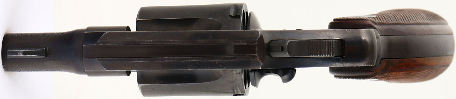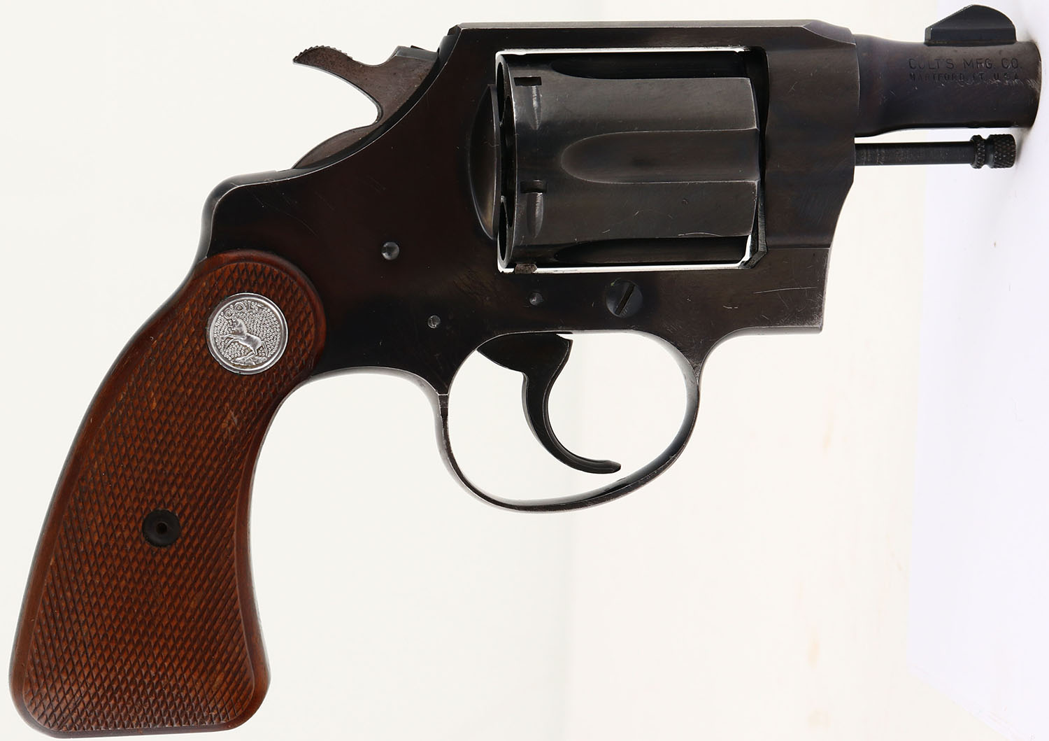 Colt, Detective Special - 2nd Issue, CAL: 38 SPL, MFG: 1959, SN: 727310, Double Action Revolver, 2'' barrel. The Colt logo medallion checkered wood grips are excellent, with minor handling marks & slightly smooth checkering. The metal blue finish on the barrel rates 90%, with wear at the muzzle & scratches on the right side of the barrel. The frame rates 85%, with edge wear, light speckling & scratches to the right side of the frame ahead of the trigger guard. The trigger guard rates appx. 70%, with concentrated wear to the backstrap & butt. The cylinder rates appx 85%, with edge/holster wear & intermittent spotting toned to a brown patina. Bore is excellent. Integral square notch rear sight & serrated blade front sight. FFL or C&R Req. - Value: 450 to 850