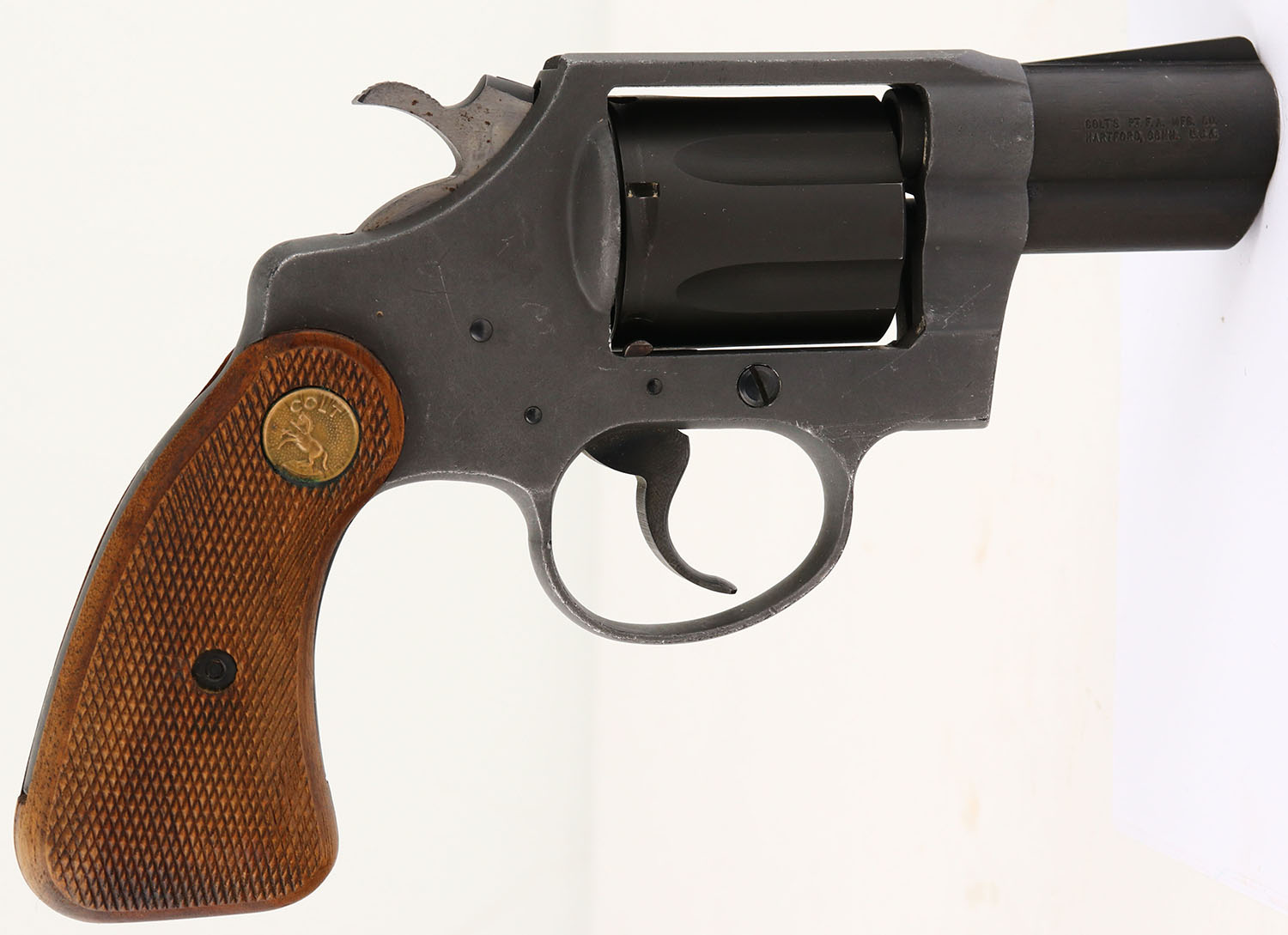 Colt, Agent L.W. - 2nd Issue, CAL: 38 SPL, MFG: 1982, SN: W14900, Double Action Revolver, 2 1/4'' barrel. The Colt logo medallion wraparound checkered wood grips are excellent. The restored matte finish is very good. There cleaned pitting on the outside of the cylinder swing gate that has finish in it, along with multiple minor scrapes, dings & nicks to the finish. Bore is excellent, with light frosting in the lands & grooves. Integral notch rear sight & smooth ramp front sight. FFL Req. - Value: 250 to 450