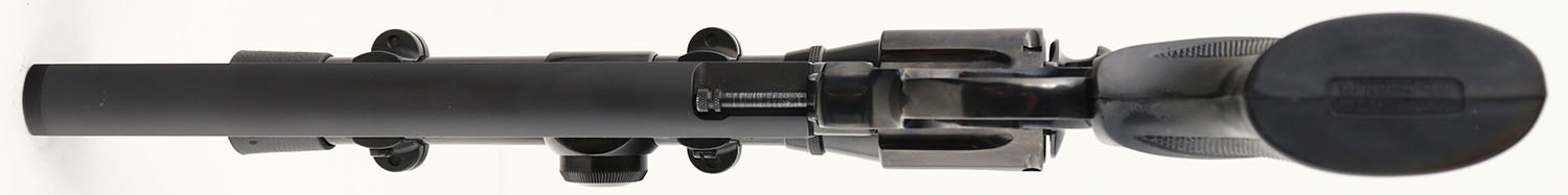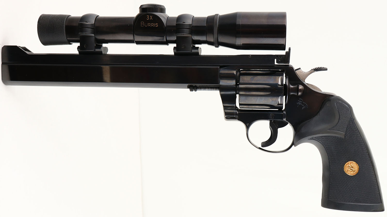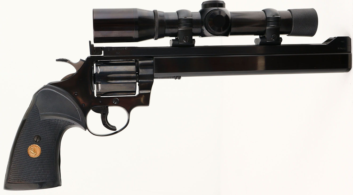 Custom, Colt, Police Positive Special or Detective Special Frame, CAL: 32, MFG: 1975, SN: M21482, Double Action Revolver, 9'' barrel w/ BO-MAR rib. The Colt logo medallion checkered rubber grips are excellent. The metal blue finish on the barrel rates 99%, & the frame rates 99%. There is some minimal discoloration of blue on the barrel. Bore is excellent. Adjustable rear sight & winged blade front sight. The revolver carries a 3x Burris scope, optic glass is clear. Trigger shoe added. Spur hammer. A nicely customized Colt revolver for target shooting. FFL Req. - Value: 700 to 1400