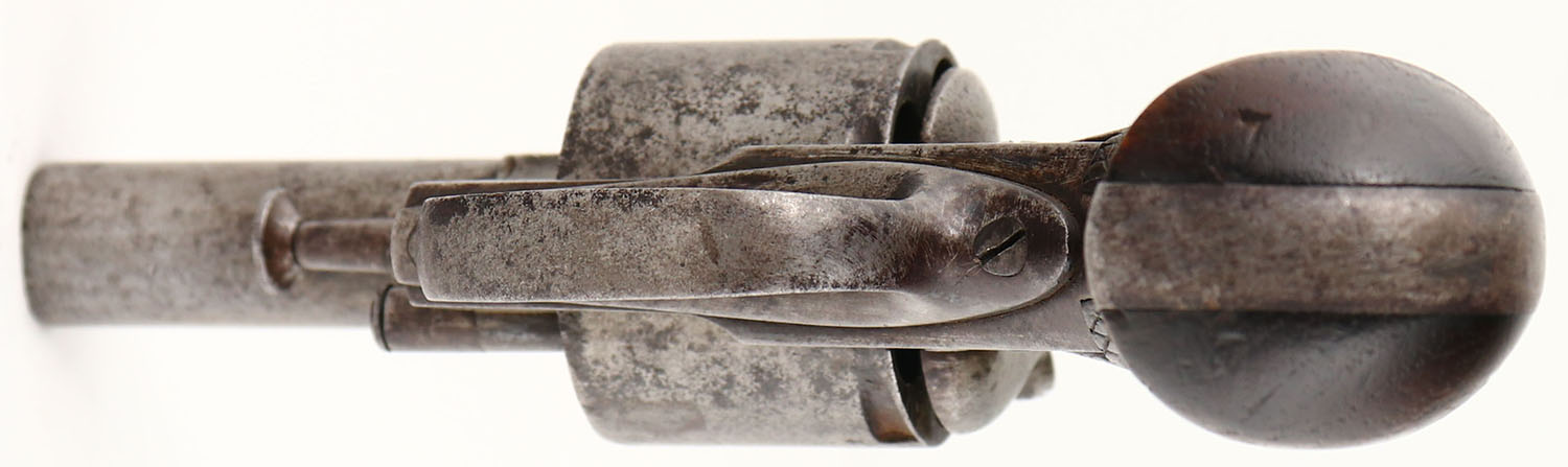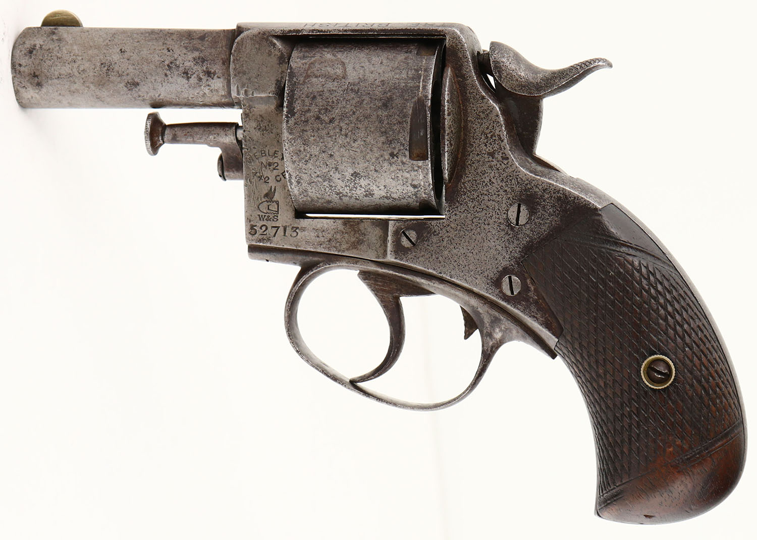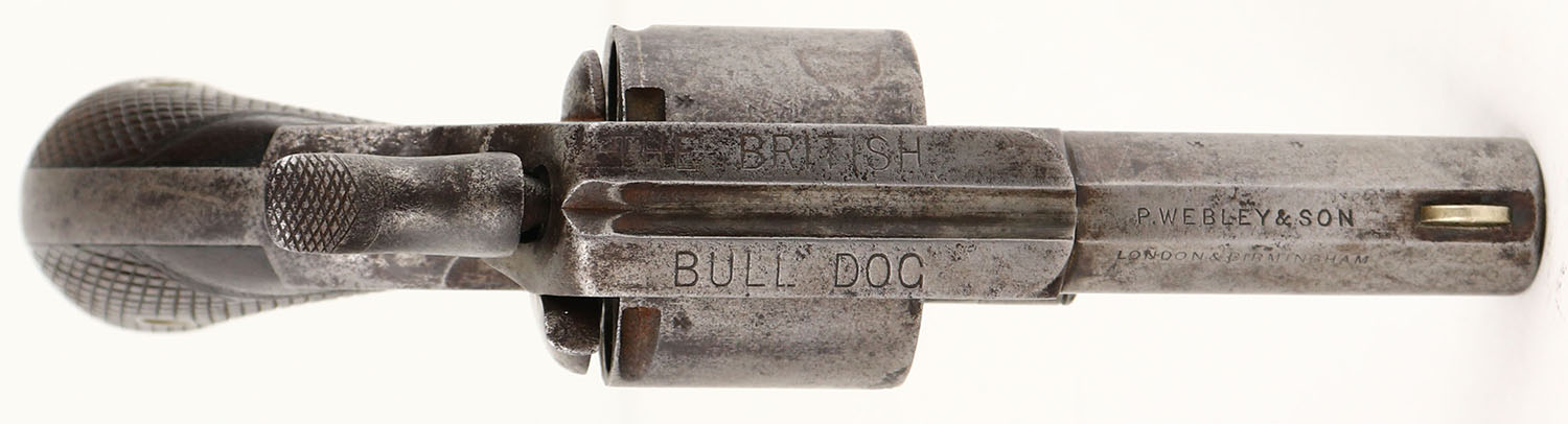 Webley & Son, The British Bulldog, CAL: marked .442 CF, MFG: circa 1880's, SN: 52713, Double Action Revolver, 2 1/2'' barrel. The top of the barrel is marked ''P.WEBLEY & SON'', the right side of the barrel is marked ''LONDON & BIRMINGHAM''. The top of the frame is marked in two lines ''THE BRITISH BULL DOG''. The left side of the frame is marked ''WEBLEY'S NO 2 442 CF'' in an oval, above the flying bullet logo & ''W&S''. The full SN can be seen below the previous markings. The checkered birds head style wood grips are very good & solid. There are minor contusions, scrapes & the checkering is beginning to smooth towards the butt. The metal finish has fully worn to a mix of metal gray & brown patina, with consistent cleaned pitting throughout. Bore is fair, consistently rough, with intermittent pitting. Integral V-notch rear sight & blade front sight. Cylinder free spins when the hammer is down, & has some play when hammer is cocked. Antique, No FFL Req. - Value: 150 to 350