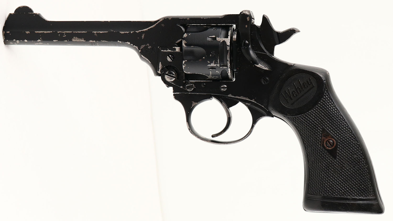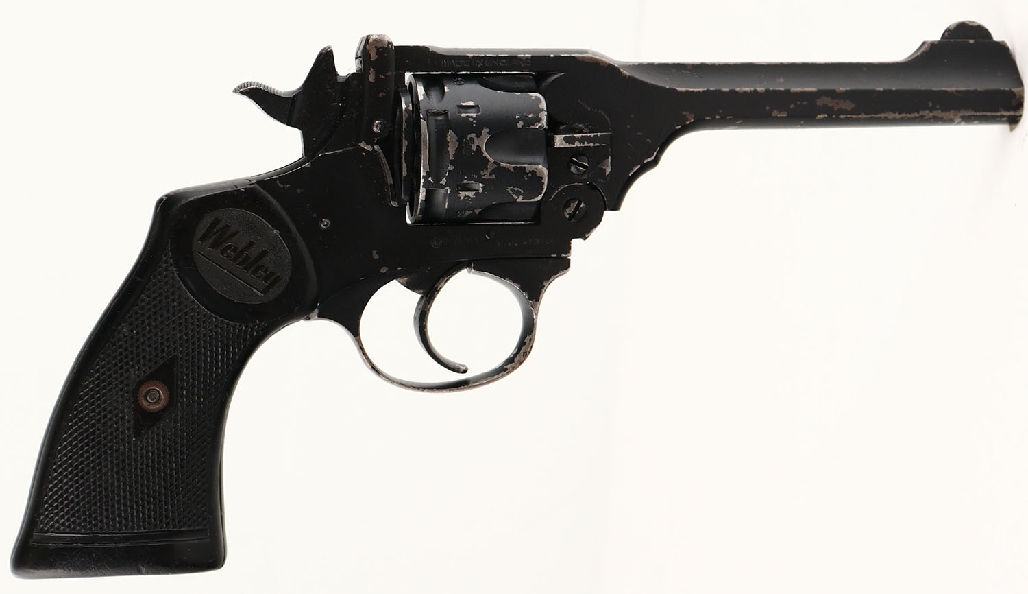Webley & Scott Ltd. Mark IV ''War Finish'', CAL: marked .38 145/200, MFG: 1940-41, SN: 47020, Double Action Revolver, 5'' barrel. The top of the frame is marked ''WEBLEY & SCOTT LTD'' over ''BIRMINGHAM''. The top left side of the frame is marked ''MARK IV .38 145/200'', ahead of the cylinder are (3) proof marks & below the cylinder is marked '' PAT186131''. The top right side of the frame is marked ''MADE IN ENGLAND'', below the receiver is the full SN & ahead of that the frame is marked ''WAR FINISH''. There are a few thin proof marks & a visible broad arrow proof mark just above the right grip. The Webley checkered Bakelite grips are very good & solid. There are numerous scratches, scrapes & dings. The matte black ''War Finish'' rates 80% overall, with consistent & even flaking throughout. Bore is excellent & bright, with visible wear marks from use. Integral square notch rear sight & elevated blade front sight. FFL or C&R Req. - Value: 400 to 800