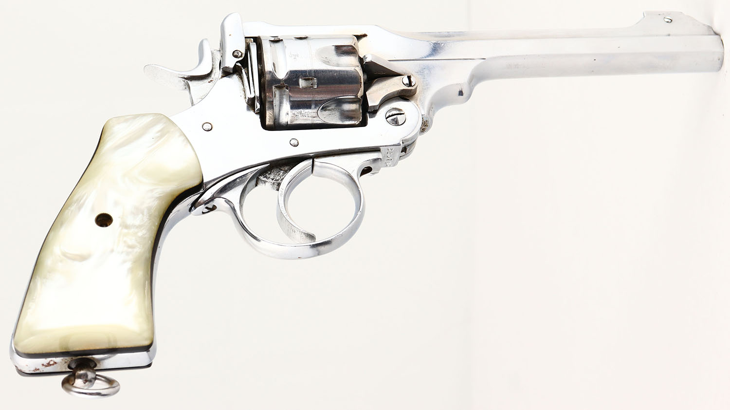 Webley, Mark VI, CAL: .455 Webley, MFG: 1915-23, SN: 380163, Double Action Revolver, 6'' barrel. The top left side of the frame is marked with (5) proof marks, ahead of ''MARK VI''. The left side of the frame below the cylinder is marked with (New Zealand Broad Arrow) ''N^Z'' ''WEBLEY MARK VI PATENT 1918'' ahead of (2) proof marks that are not legible. Ahead of the cylinder on the barrel is marked ''PROOF .455 700/060? 6 TONS PER''. The top of the back strap is marked ''N^Z'' over ''3/21'' over ''771''. There are multiple broad arrow proof marks throughout the revolver. The SN can be seen on the rear of the cylinder, trigger guard & front side of the barrel above the tip-up swivel. The faux pearl grips are excellent. The nickel finish is excellent overall, with only a small area of flaking on the backstrap. There are numerous thin brush lines & a couple areas of haze ahead of the cylinder. Bore is excellent, with intermittent frost/haze. Integral U-notch rear sight & elevated pinned blade front sight. Lanyard loop present. The cylinder locks up when the hammer is down & has a small amount of play. There is also a small amount of play in the cylinder when the hammer is cocked. FFL or C&R Req. - Value: 1000 to 2000