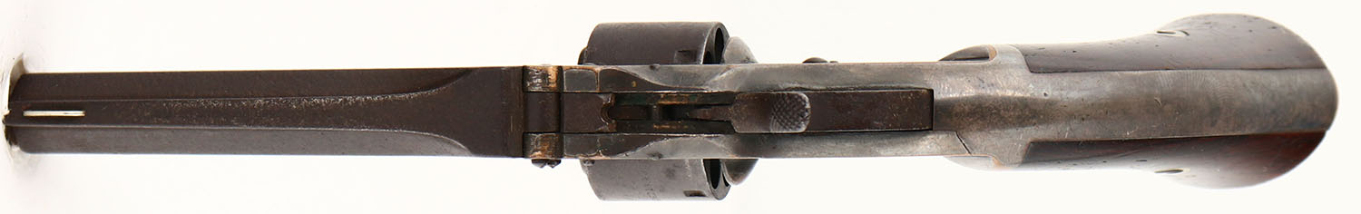 Smith & Wesson, 1st Model - 2nd Issue, CAL: .22 SHORT, MFG: 1860-68, SN: 31075, Single Action Tip-Up Revolver, 3 1/4'' barrel. The two-piece wood grips are excellent, with scrapes, & minor nicks/dings. The finish is beginning to thin towards the bottom of the left grip. The metal blue finish on the barrel & cylinder has fully toned to a brown patina. The silver plated frame is a mix of faded silver, gray/brown patina & areas worn to reveal the brass frame. Bore is fair & dark, with pitting. Appx. 115,000 2nd Issue 1st Models were produced. Antique, No FFL Req. - Value: 200 to 400