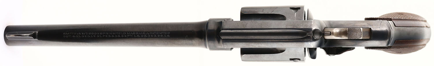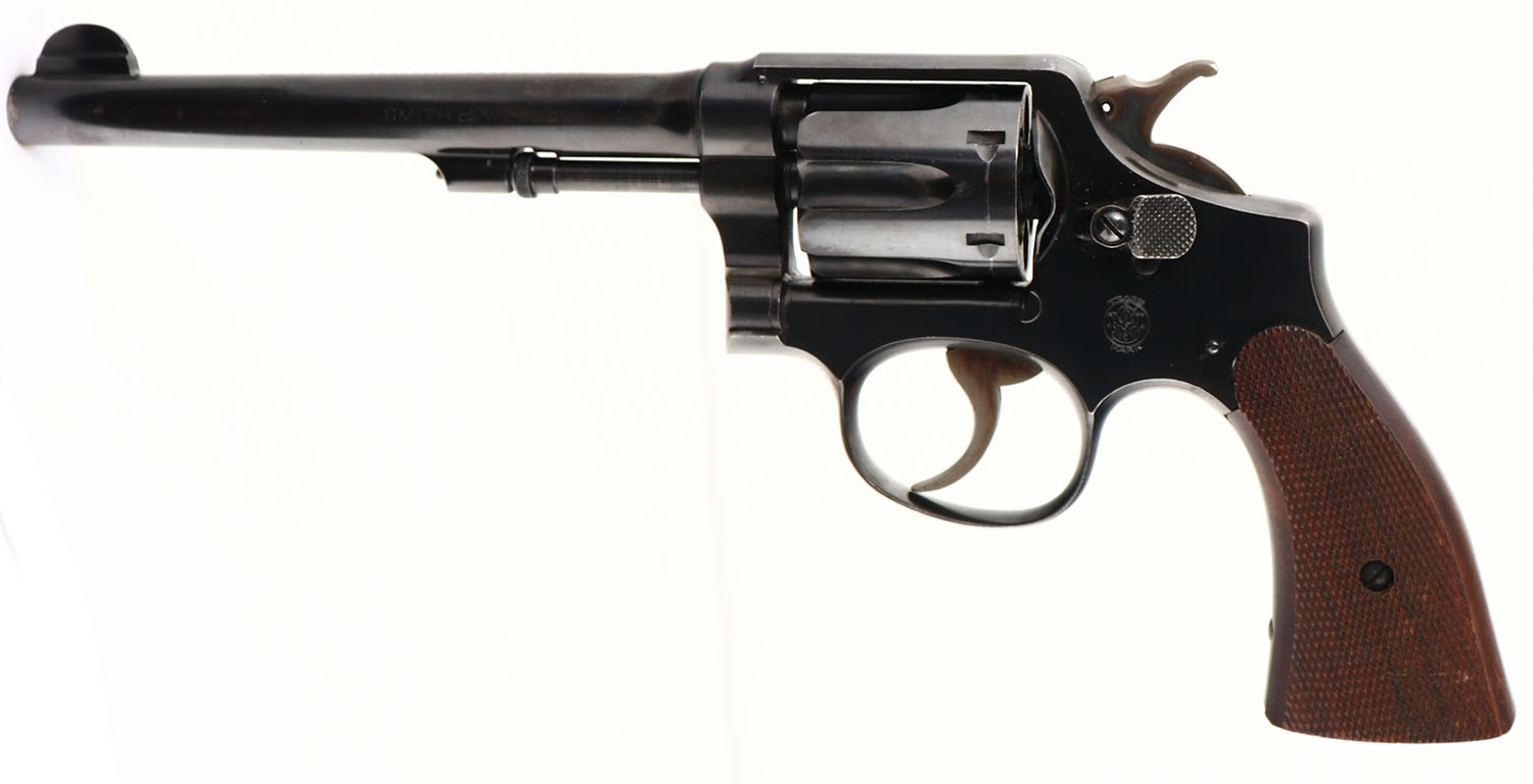 Smith & Wesson, .38 M&P Model of 1905 - 4th Change, CAL: .38 S&W SPL, MFG: 1915-42, SN: 405227, Double Action Revolver, 6'' barrel. The replaced checkered wood grips are excellent. The original metal blue finish rates 95% overall, with concentrated loss at the muzzle & right side of frame. The case-hardened trigger & hammer retain faded, but visible case-colors. Bore is excellent. Small integral notch rear sight & blade front sight. FFL or C&R Req. - Value: 600 to 1100