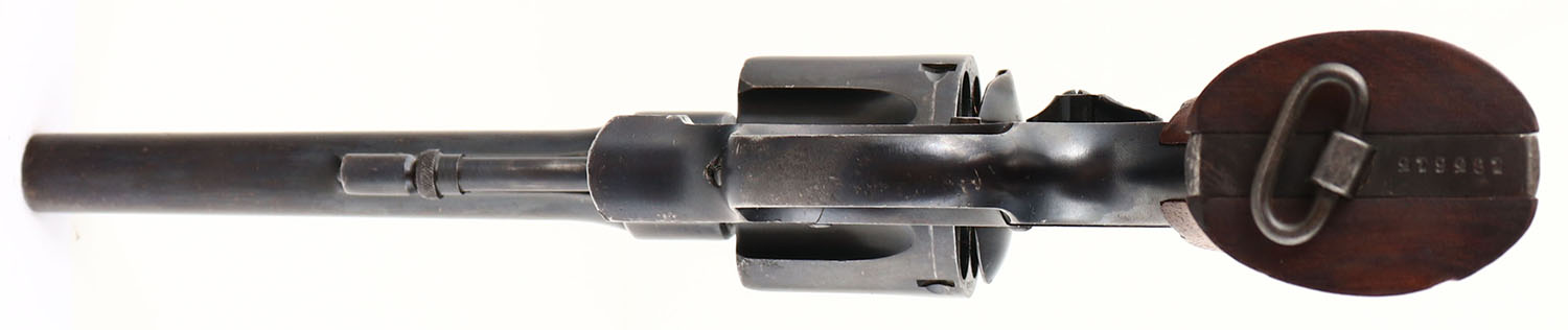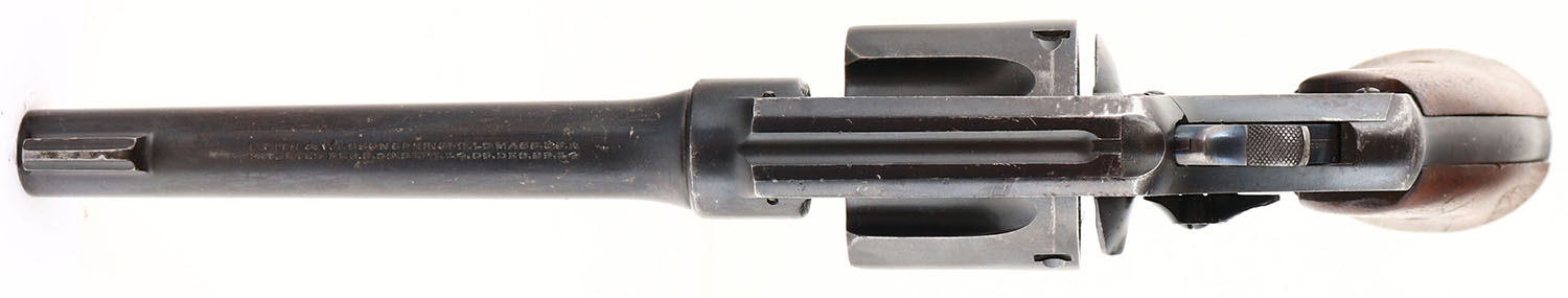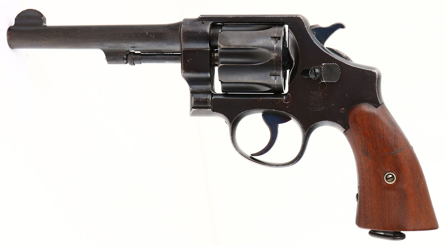 Smith & Wesson, Model 1917 Brazilian Contract (1st Contract), CAL: 45 ACP, MFG: 1937, SN: 185615, Double Action Revolver, 5 1/2'' barrel. The top of the barrel has standard address & patent dates. Standard markings on the barrel & frame. The right side of the frame carries the Brazilian crest & bears the date ''1937''. The original smooth walnut grips are excellent. There are a couple dings & light scrapes. The metal blue finish rates 80% on the barrel & 85% on the frame. There are thinned areas toning to a brown patina with concentrated loss on the back strap & muzzle. Bore is good & bright, with consistent roughness/spotting throughout. Notch & blade sights. 25,000 Model 1917's were made for the Brazilian Government. This example was apart of the first shipment in 1938, which was a majority of all the pistols sent. Lanyard loop present. FFL or C&R Req. - Value: 350 to 550