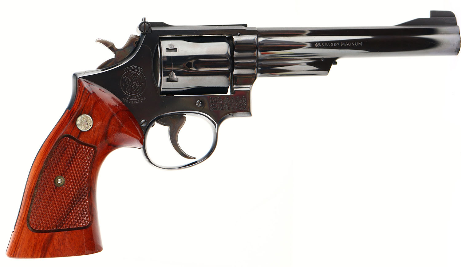 BOXED, Smith & Wesson, Model 19-3, CAL: 357 MAG, MFG: 1970, SN: 2K11364, Double Action Revolver, 6'' barrel. The S&W logo medallion checkered wood grips are excellent. The original metal blue finish rates 98% on the barrel & 99% on the frame. The case-hardened trigger & hammer retain nice case-colors. Bore is excellent. Adjustable rear sight & ramp elevated blade front sight. Comes in correct model box, no end label This revolver also comes with a wood presentation case, with army green/black plastic interior. FFL or C&R Req. - Value: 500 to 900