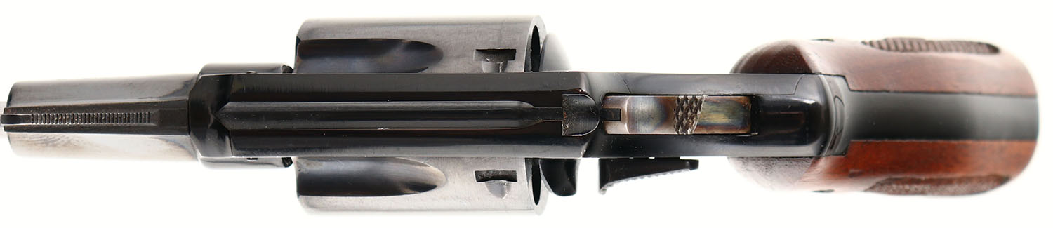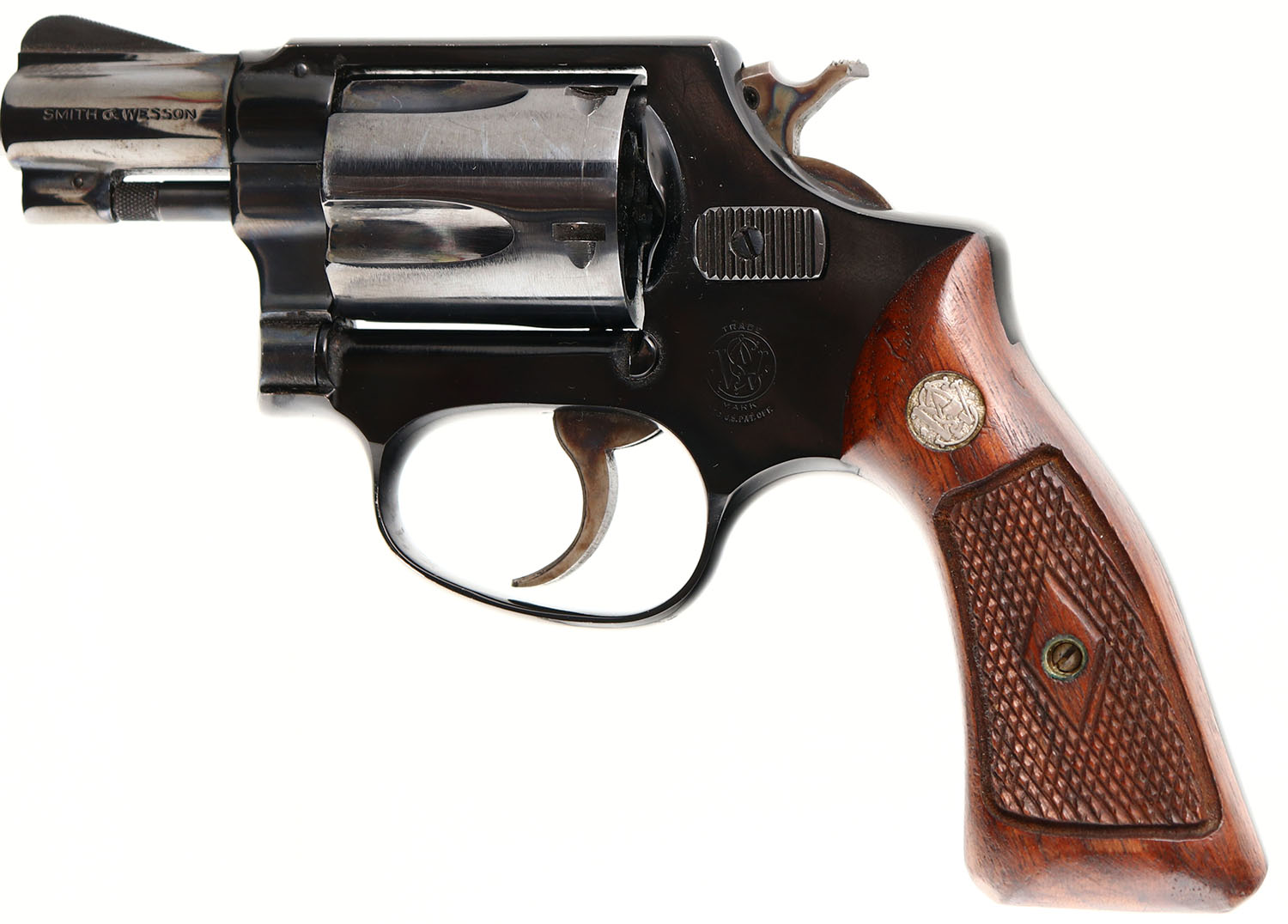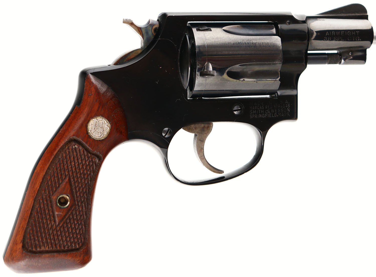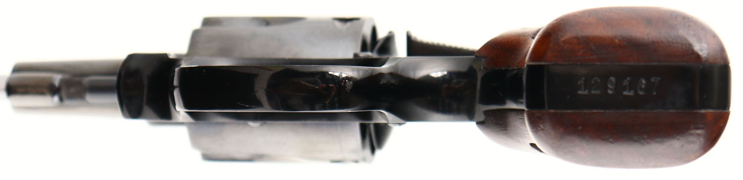 Smith & Wesson, Model 37 - Chief's Special Airweight, CAL: .38 SPL, MFG: 1951-57, SN: 129167, Double Action Revolver, 2'' barrel. The S&W logo medallion checkered wood grips are excellent. The original metal blue finish rates 98% overall, with some haze in crevices. The case-hardened trigger & hammer retain visible case-colors. Bore is excellent. Integral square notch rear sight & serrated blade front sight. FFL or C&R Req. - Value: 400 to 700