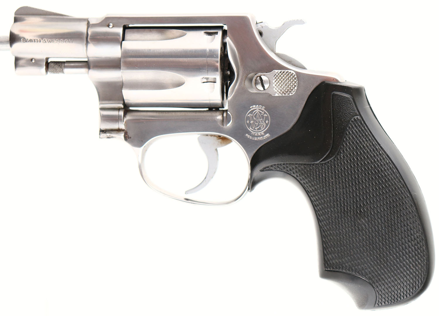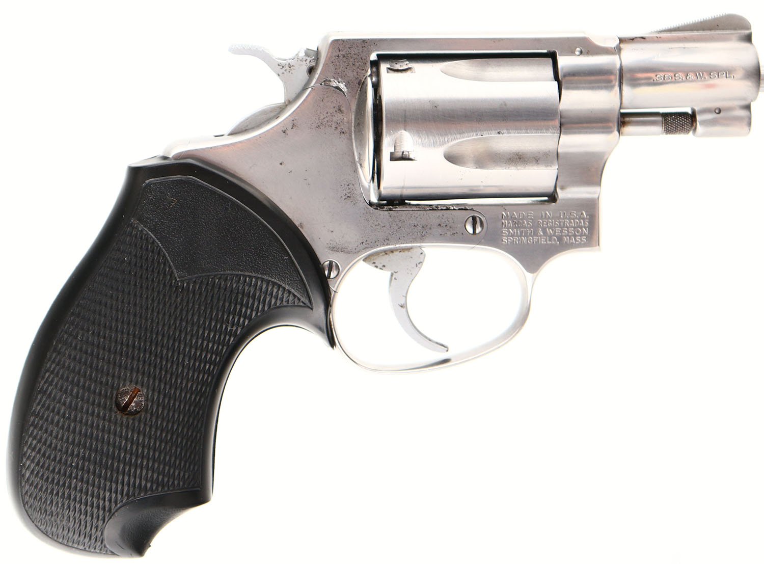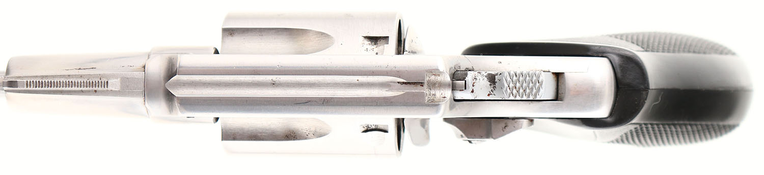 Smith & Wesson, Model 60, CAL: 38 SPL, MFG: 1979-80, SN: R247353, Double Action Revolver, 1 7/8'' barrel. The Pachmayr checkered hard rubber grips are excellent. The stainless steel finish is very good, with intermittent pitting concentrated to the right side of the frame, trigger guard & a small area on the cylinder. Bore is excellent. Integral square notch rear sight & blade front sight. FFL Req. - Value: 250 to 450