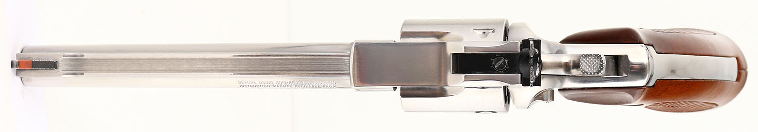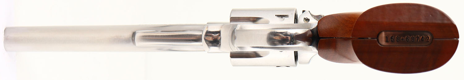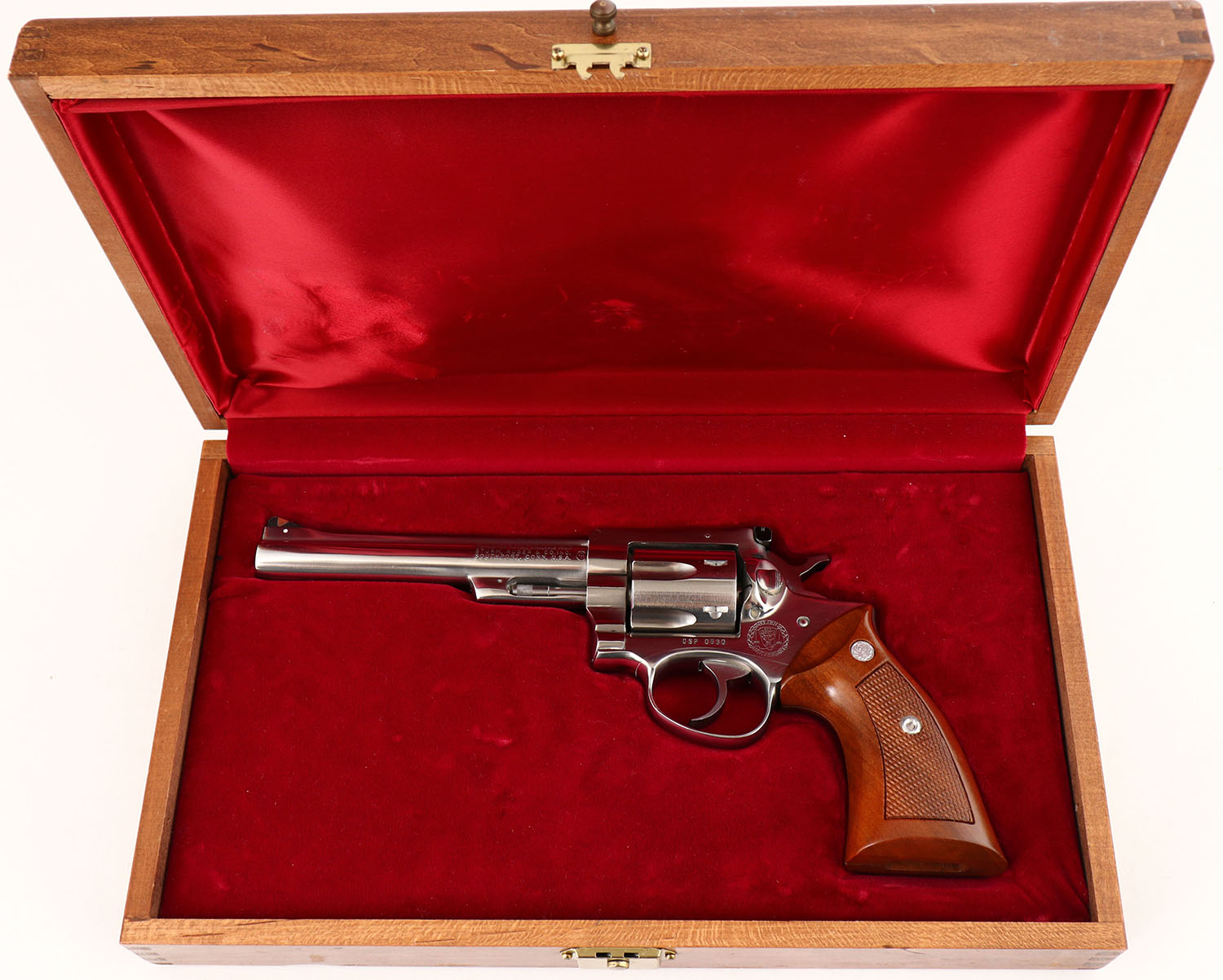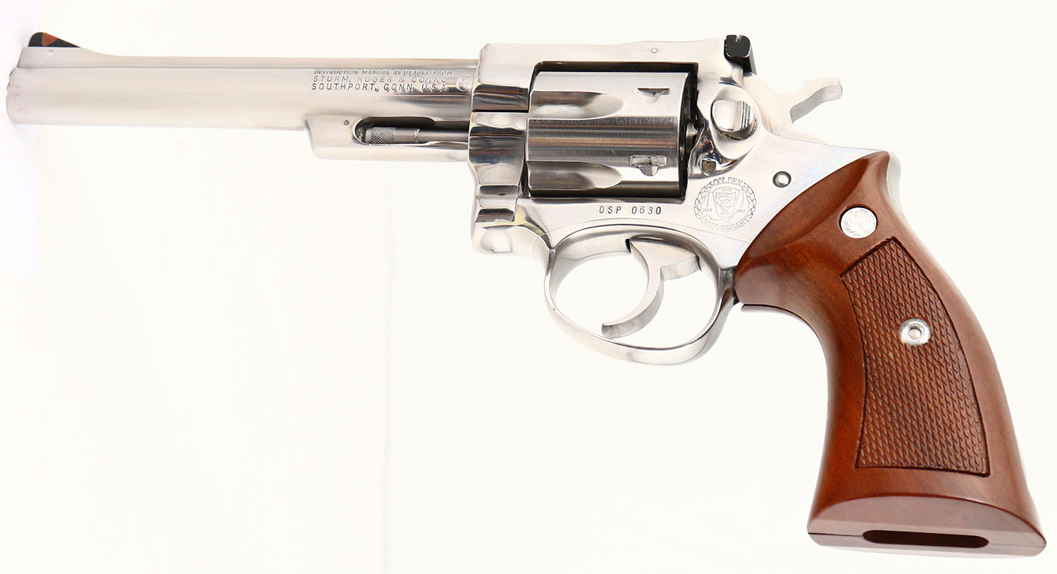 CASED, Ruger Security Six - Ohio State Highway Patrol Golden Anniversary Edition, CAL: 357 MAG, MFG: 1983, SN: OSP0630, Double Action Revolver, 6'' barrel. Standard factory markings & the right side of the frame carries the Ohio State Highway Patrol crest. The Ruger logo medallion checkered wood grips are excellent. The stainless steel finish is excellent overall. Bore is excellent. Adjustable rear sight & serrated blade front sight with orange insert. Comes in factory presentation case, with burgundy interior. FFL Req. - Value: 600 to 900