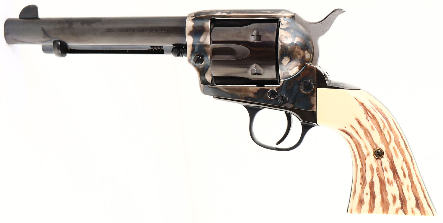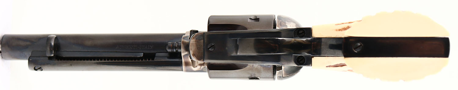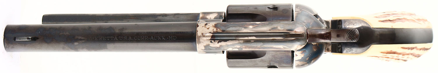 Beretta, Stampede, CAL: 45LC, MFG: Modern, SN: B03621, Single Action Revolver, 5 1/2'' barrel. The faux Stag horn grips are excellent. The metal blue finish on the barrel rates 90%, with consistent spotting on the right side of the barrel & ejector housing. The cylinder is beginning to tone plum. The case-hardened frame retains vivid case-colors. Bore is excellent. Square notch rear sight & blade front sight. FFL Req. - Value: 350 to 550