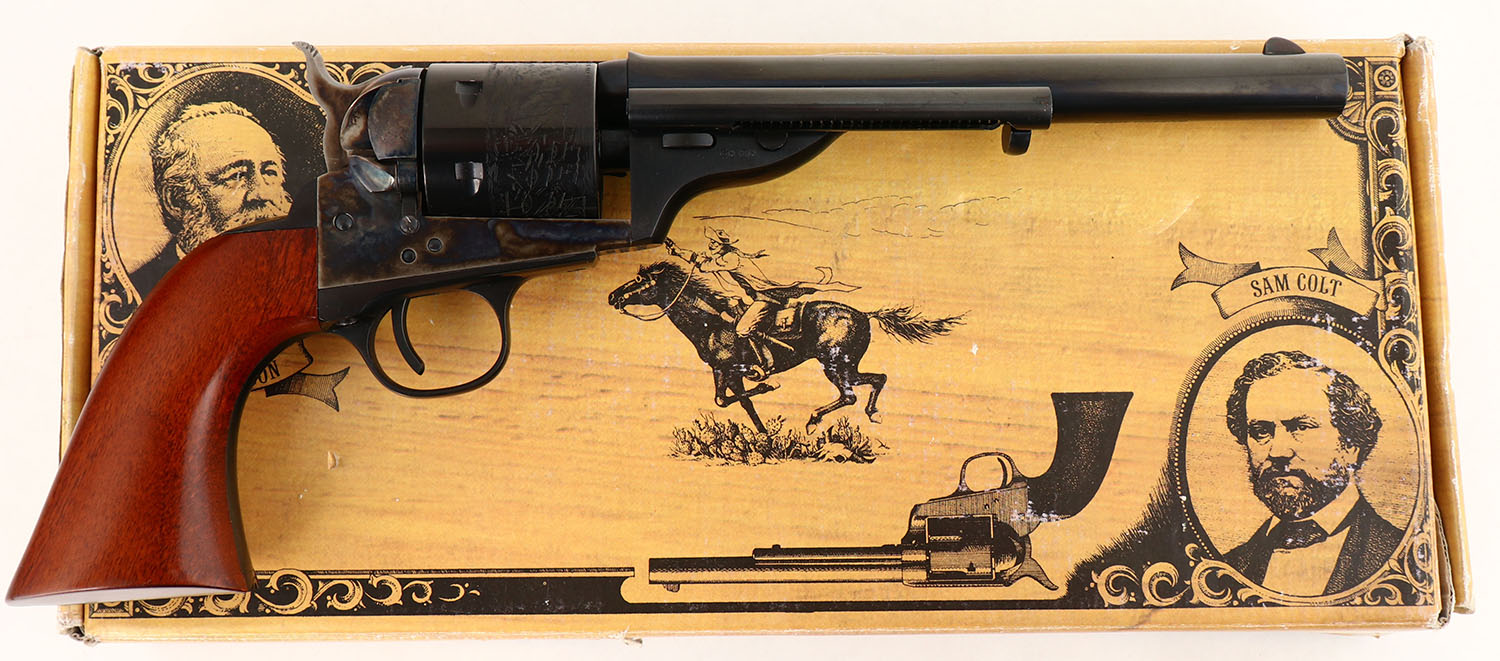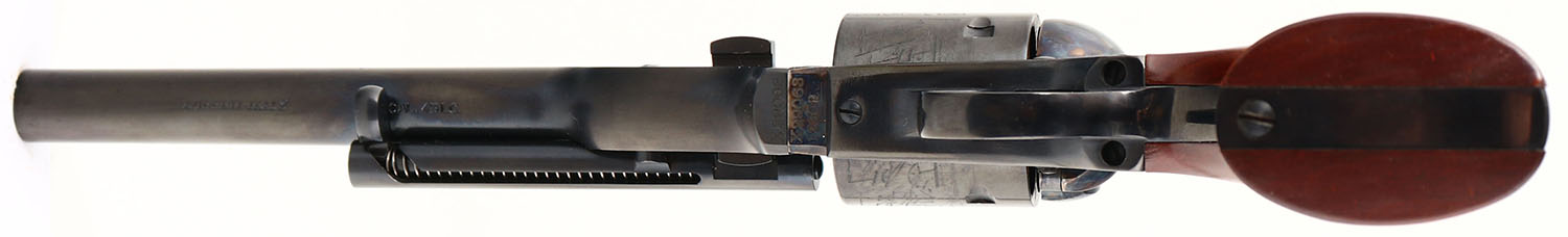 BOXED, Uberti (Cimarron) 1871 Open Top Army, CAL: 45LC, MFG: Modern, SN: X29063, Single Action Revolver, 7 1/2'' barrel. The wood grips are excellent. The metal blue finish on the barrel, cylinder & trigger guard rates 99%+ overall. The case-hardened frame retains vivid case-colors. Bore is excellent. Comes in factory box, with related paperwork, tool, lock/key. FFL Req. - Value: 400 to 600