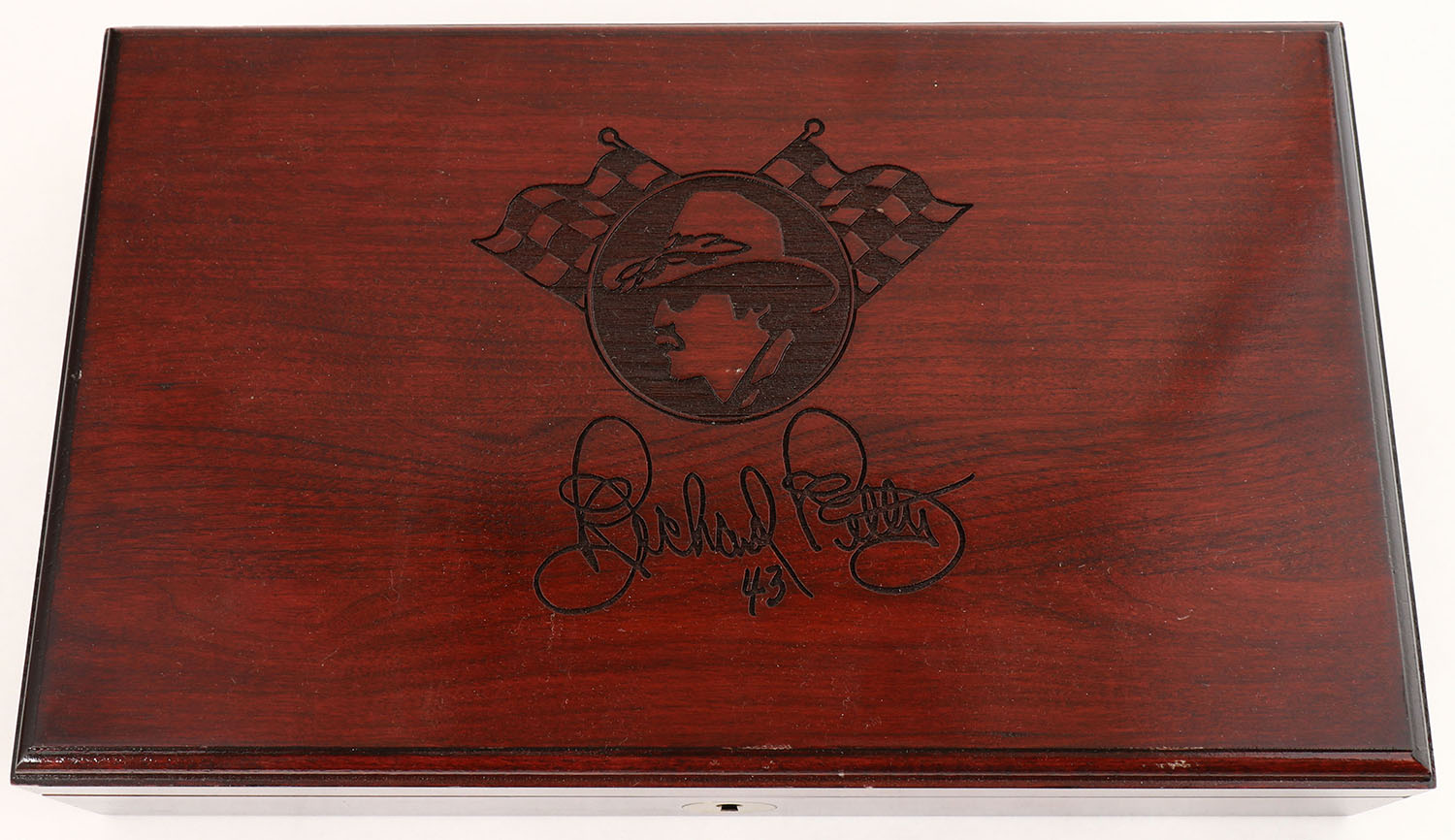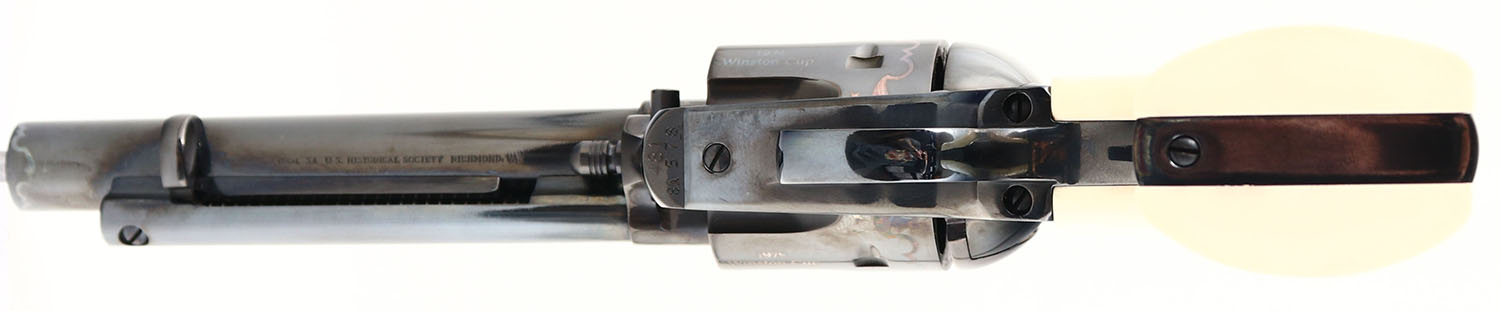 CASED, United States Historical Society (Uberti Mfg), Richard Petty Silver Edition S.A.A. #481 of 1000, CAL: 45, MFG: Modern, SN: SA578, Single Action Revolver, 5 1/2'' barrel. Standard caliber & address stamp on the bottom of the barrel. The left side of the barrel is marked ''RICHARD PETTY 43'', the right side of the barrel is marked ''KING RICHARD''. The ejector rod housing displays race cars. The left side of the frame is marked ''1964 WINSTON CUP''. The right side of the frame is marked with a checkered flag. The cylinder has a list of Winston Cup win dates & the left cylinder shoulder has a image of Richard Petty. All markings are accompanied by simple decorative line/star pattern. The grips have R.P signature. The faux ivory grips are mint. The high gloss blued finish rates 100% overall. Bore is mint. V-notch rear sight & blade front sight. Comes in factory display case, with blue interior & plaque. Included is related paperwork, certificate & case key. Only 1000 produced. FFL Req. - Value: 800 to 1500