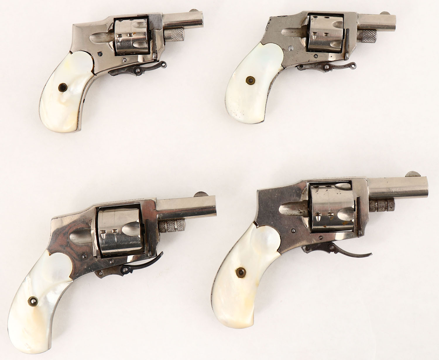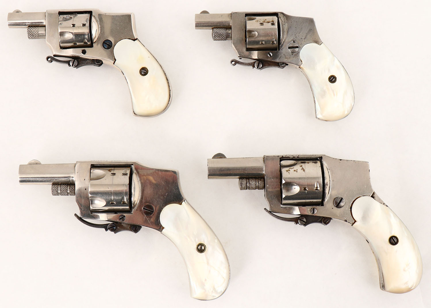 UNIQUE, Set of 4 - Variety of Kolb Hammerless Pistols: 1) Kolb, Baby Hammerless, CAL: 32 S&W, MFG: circa 1910-30, SN: 385, Double Action Revolver, 1 3/4'' barrel. The Mother of Pearl grips are very good & solid. The top right corner of the left grip has an edge chip, otherwise excellent, with minor handling marks. The nickel finish rates 95% overall, with minor flaking & spotting toned to a brown patina. Bore is good, consistently rough, with intermittent pitting & thin rifling. Blade front sight. Folding trigger.